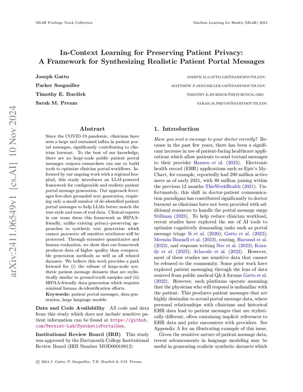 In-Context Learning for Preserving Patient Privacy: A Framework for