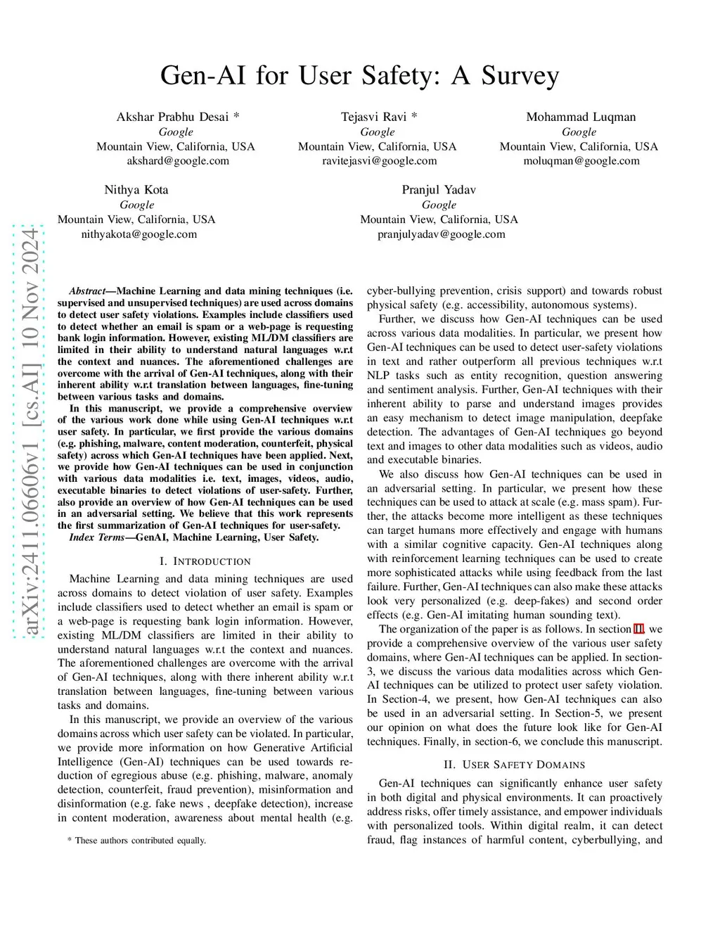 Machine Learning and data mining techniques (i.e. supervised and unsupervised techniques) are used across domains to detect user safety violations. Examples include classifiers used to detect whether an email is spam or a web-page is requesting bank login information. However, existing ML/DM classifiers are limited in their ability to understand natural languages w.r.t the context and nuances. The aforementioned challenges are overcome with the arrival of Gen-AI techniques, along with their inherent ability w.r.t translation between languages, fine-tuning between various tasks and domains. In this manuscript, we provide a comprehensive overview of the various work done while using Gen-AI techniques w.r.t user safety. In particular, we first provide the various domains (e.g. phishing, malware, content moderation, counterfeit, physical safety) across which Gen-AI techniques have been applied. Next, we provide how Gen-AI techniques can be used in conjunction with various data modalities i.e. text, images, videos, audio, executable binaries to detect violations of user-safety. Further, also provide an overview of how Gen-AI techniques can be used in an adversarial setting. We believe that this work represents the first summarization of Gen-AI techniques for user-safety.