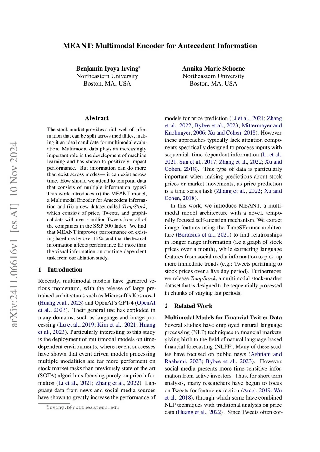 The stock market provides a rich well of information that can be split across modalities, making it an ideal candidate for multimodal evaluation. Multimodal data plays an increasingly important role in the development of machine learning and has shown to positively impact performance. But information can do more than exist across modes -- it can exist across time. How should we attend to temporal data that consists of multiple information types? This work introduces (i) the MEANT model, a Multimodal Encoder for Antecedent information and (ii) a new dataset called TempStock, which consists of price, Tweets, and graphical data with over a million Tweets from all of the companies in the S&P 500 Index. We find that MEANT improves performance on existing baselines by over 15%, and that the textual information affects performance far more than the visual information on our time-dependent task from our ablation study.