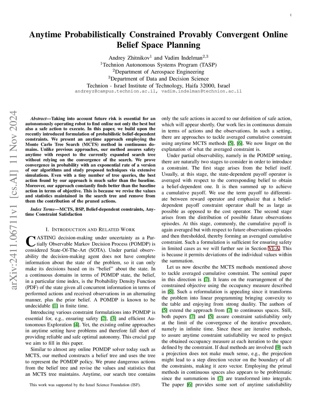 Taking into account future risk is essential for an autonomously operating robot to find online not only the best but also a safe action to execute. In this paper, we build upon the recently introduced formulation of probabilistic belief-dependent constraints. We present an anytime approach employing the Monte Carlo Tree Search (MCTS) method in continuous domains. Unlike previous approaches, our method assures safety anytime with respect to the currently expanded search tree without relying on the convergence of the search. We prove convergence in probability with an exponential rate of a version of our algorithms and study proposed techniques via extensive simulations. Even with a tiny number of tree queries, the best action found by our approach is much safer than the baseline. Moreover, our approach constantly finds better than the baseline action in terms of objective. This is because we revise the values and statistics maintained in the search tree and remove from them the contribution of the pruned actions.