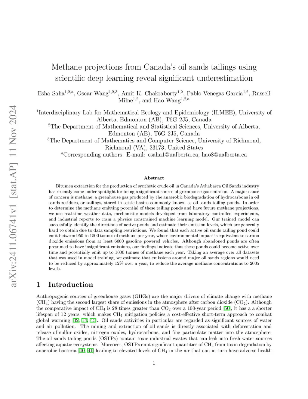 Bitumen extraction for the production of synthetic crude oil in Canada's Athabasca Oil Sands industry has recently come under spotlight for being a significant source of greenhouse gas emission. A major cause of concern is methane, a greenhouse gas produced by the anaerobic biodegradation of hydrocarbons in oil sands residues, or tailings, stored in settle basins commonly known as oil sands tailing ponds. In order to determine the methane emitting potential of these tailing ponds and have future methane projections, we use real-time weather data, mechanistic models developed from laboratory controlled experiments, and industrial reports to train a physics constrained machine learning model. Our trained model can successfully identify the directions of active ponds and estimate their emission levels, which are generally hard to obtain due to data sampling restrictions. We found that each active oil sands tailing pond could emit between 950 to 1500 tonnes of methane per year, whose environmental impact is equivalent to carbon dioxide emissions from at least 6000 gasoline powered vehicles. Although abandoned ponds are often presumed to have insignificant emissions, our findings indicate that these ponds could become active over time and potentially emit up to 1000 tonnes of methane each year. Taking an average over all datasets that was used in model training, we estimate that emissions around major oil sands regions would need to be reduced by approximately 12% over a year, to reduce the average methane concentrations to 2005 levels.
