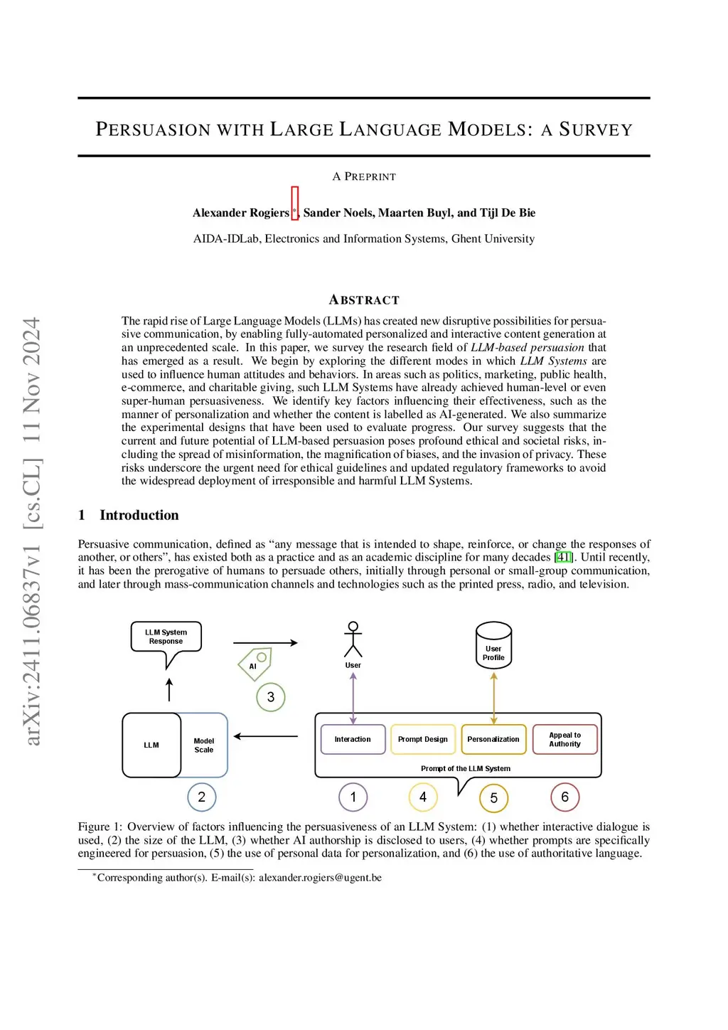 The rapid rise of Large Language Models (LLMs) has created new disruptive possibilities for persuasive communication, by enabling fully-automated personalized and interactive content generation at an unprecedented scale. In this paper, we survey the research field of LLM-based persuasion that has emerged as a result. We begin by exploring the different modes in which LLM Systems are used to influence human attitudes and behaviors. In areas such as politics, marketing, public health, e-commerce, and charitable giving, such LLM Systems have already achieved human-level or even super-human persuasiveness. We identify key factors influencing their effectiveness, such as the manner of personalization and whether the content is labelled as AI-generated. We also summarize the experimental designs that have been used to evaluate progress. Our survey suggests that the current and future potential of LLM-based persuasion poses profound ethical and societal risks, including the spread of misinformation, the magnification of biases, and the invasion of privacy. These risks underscore the urgent need for ethical guidelines and updated regulatory frameworks to avoid the widespread deployment of irresponsible and harmful LLM Systems.
