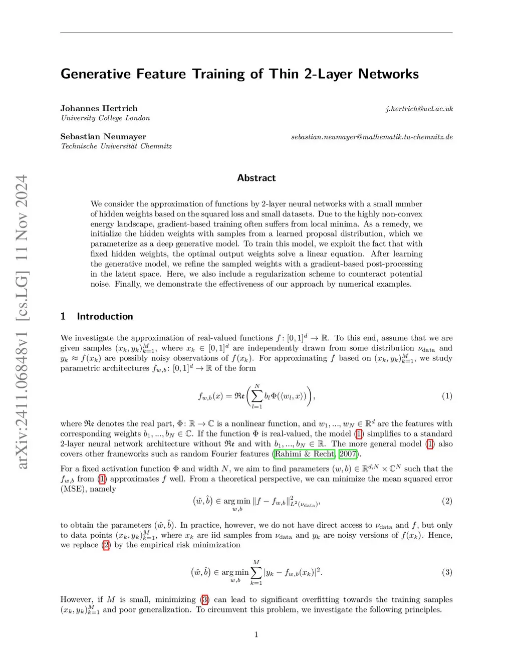 Generative Feature Training of Thin 2-Layer Networks