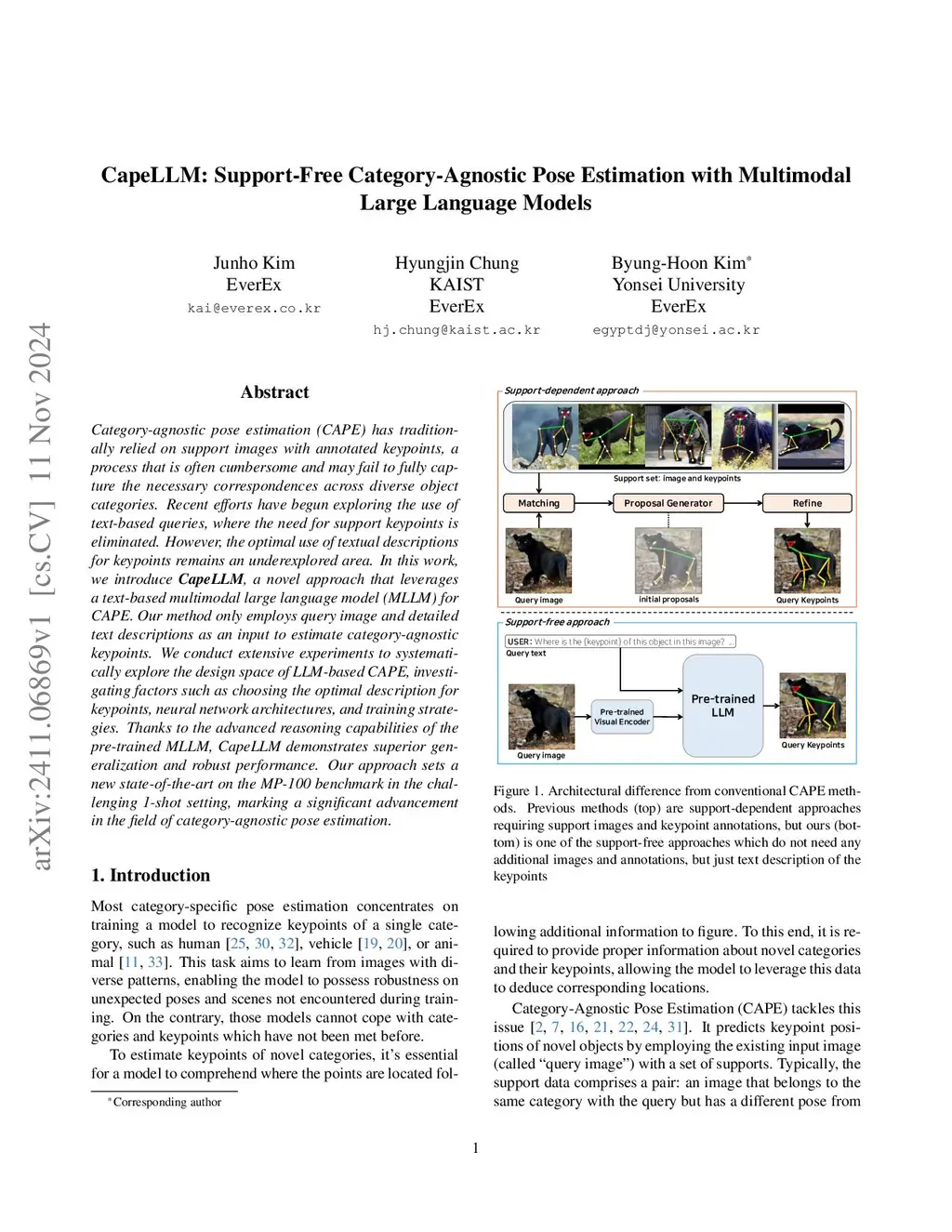 Category-agnostic pose estimation (CAPE) has traditionally relied on support images with annotated keypoints, a process that is often cumbersome and may fail to fully capture the necessary correspondences across diverse object categories. Recent efforts have explored the use of text queries, leveraging their enhanced stability and generalization capabilities. However, existing approaches often remain constrained by their reliance on support queries, their failure to fully utilize the rich priors embedded in pre-trained large language models, and the limitations imposed by their parametric distribution assumptions. To address these challenges, we introduce CapeLLM, the first multimodal large language model (MLLM) designed for CAPE. Our method only employs query image and detailed text descriptions as an input to estimate category-agnostic keypoints. Our method encompasses effective training strategies and carefully designed instructions for applying the MLLM to CAPE. Moreover, we propose an inference mechanism that further enhances the reasoning process for unseen keypoints. while flexibly modeling their underlying spatial distribution and uncertainty, allowing for adaptive refinement based on contextual cues. We conducted extensive experiments to apply the MLLM to CAPE effectively, focusing not only on the model architecture and prompt design but also on ensuring robustness across input variations. Our approach sets a new state-of-the-art on the MP-100 benchmark in the 1-shot and even 5-shot setting, marking a significant advancement in the field of category-agnostic pose estimation. Code is available atthis https URL.