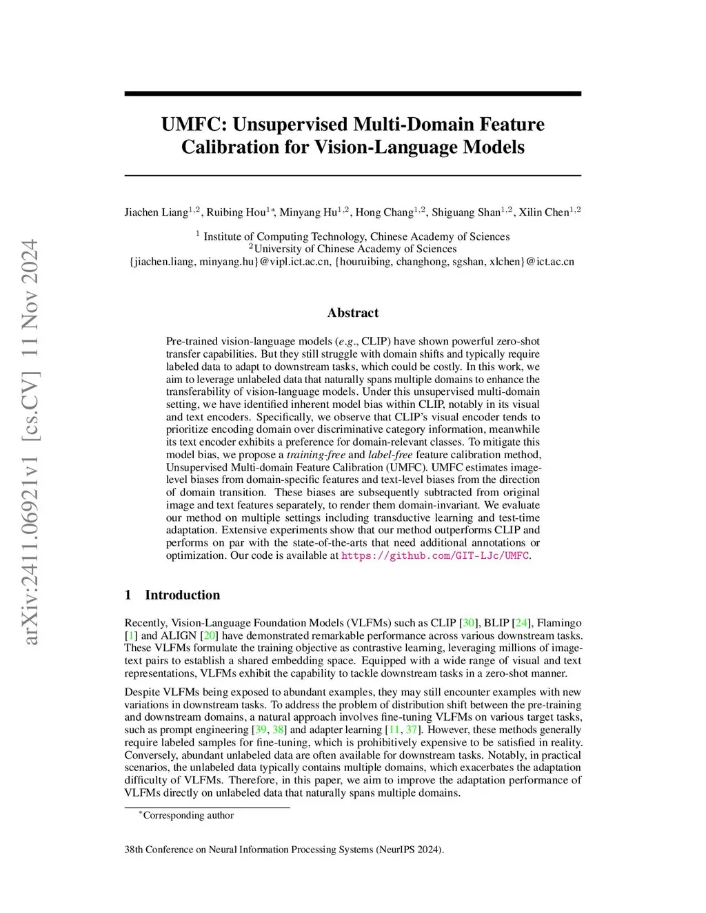 UMFC: Unsupervised Multi-Domain Feature Calibration for Vision-Language