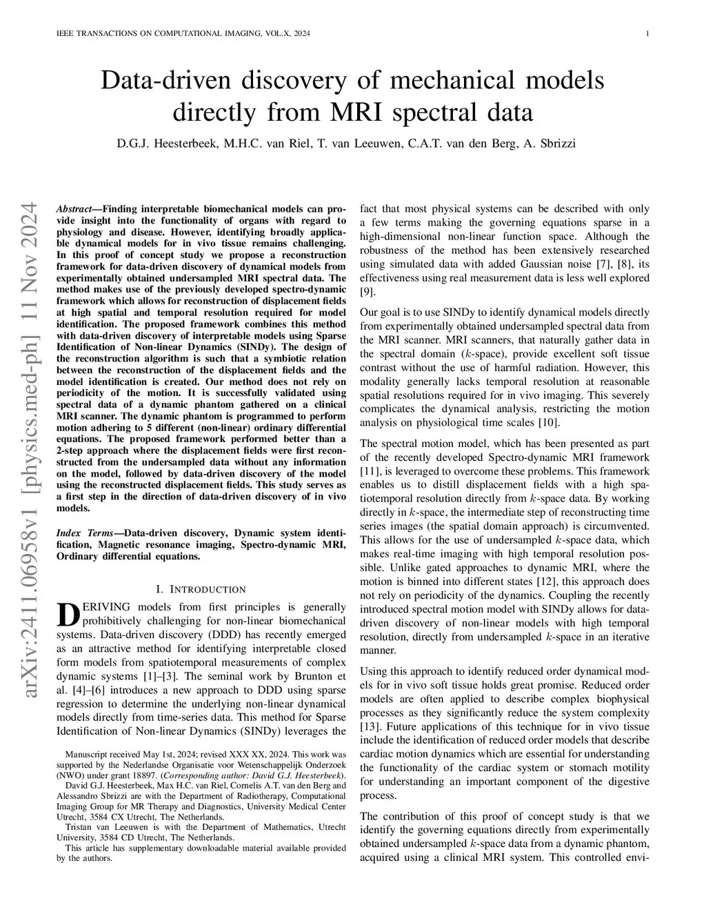 Finding interpretable biomechanical models can provide insight into the functionality of organs with regard to physiology and disease. However, identifying broadly applicable dynamical models for in vivo tissue remains challenging. In this proof of concept study we propose a reconstruction framework for data-driven discovery of dynamical models from experimentally obtained undersampled MRI spectral data. The method makes use of the previously developed spectro-dynamic framework which allows for reconstruction of displacement fields at high spatial and temporal resolution required for model identification. The proposed framework combines this method with data-driven discovery of interpretable models using Sparse Identification of Non-linear Dynamics (SINDy). The design of the reconstruction algorithm is such that a symbiotic relation between the reconstruction of the displacement fields and the model identification is created. Our method does not rely on periodicity of the motion. It is successfully validated using spectral data of a dynamic phantom gathered on a clinical MRI scanner. The dynamic phantom is programmed to perform motion adhering to 5 different (non-linear) ordinary differential equations. The proposed framework performed better than a 2-step approach where the displacement fields were first reconstructed from the undersampled data without any information on the model, followed by data-driven discovery of the model using the reconstructed displacement fields. This study serves as a first step in the direction of data-driven discovery of in vivo models.