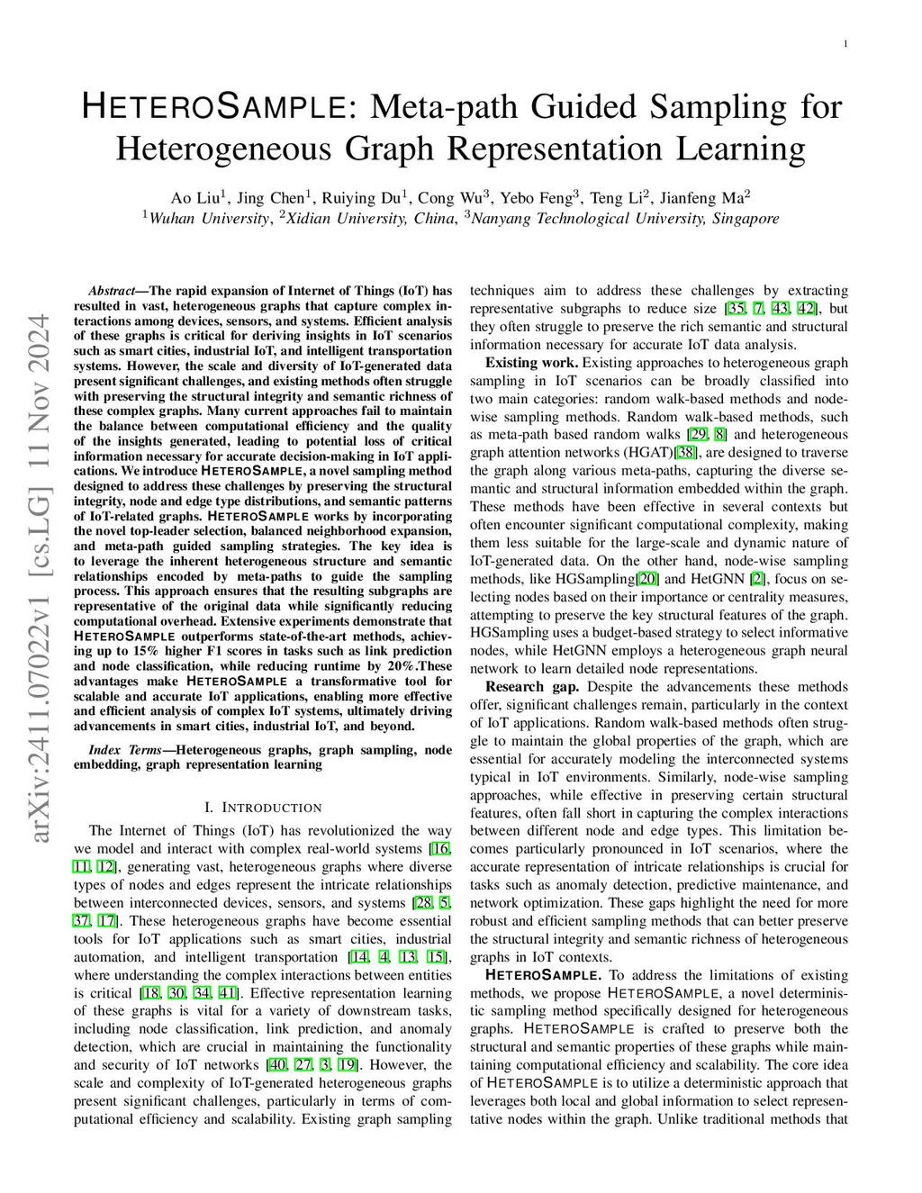The rapid expansion of Internet of Things (IoT) has resulted in vast, heterogeneous graphs that capture complex interactions among devices, sensors, and systems. Efficient analysis of these graphs is critical for deriving insights in IoT scenarios such as smart cities, industrial IoT, and intelligent transportation systems. However, the scale and diversity of IoT-generated data present significant challenges, and existing methods often struggle with preserving the structural integrity and semantic richness of these complex graphs. Many current approaches fail to maintain the balance between computational efficiency and the quality of the insights generated, leading to potential loss of critical information necessary for accurate decision-making in IoT applications. We introduce HeteroSample, a novel sampling method designed to address these challenges by preserving the structural integrity, node and edge type distributions, and semantic patterns of IoT-related graphs. HeteroSample works by incorporating the novel top-leader selection, balanced neighborhood expansion, and meta-path guided sampling strategies. The key idea is to leverage the inherent heterogeneous structure and semantic relationships encoded by meta-paths to guide the sampling process. This approach ensures that the resulting subgraphs are representative of the original data while significantly reducing computational overhead. Extensive experiments demonstrate that HeteroSample outperforms state-of-the-art methods, achieving up to 15% higher F1 scores in tasks such as link prediction and node classification, while reducing runtime by 20%.These advantages make HeteroSample a transformative tool for scalable and accurate IoT applications, enabling more effective and efficient analysis of complex IoT systems, ultimately driving advancements in smart cities, industrial IoT, and beyond.