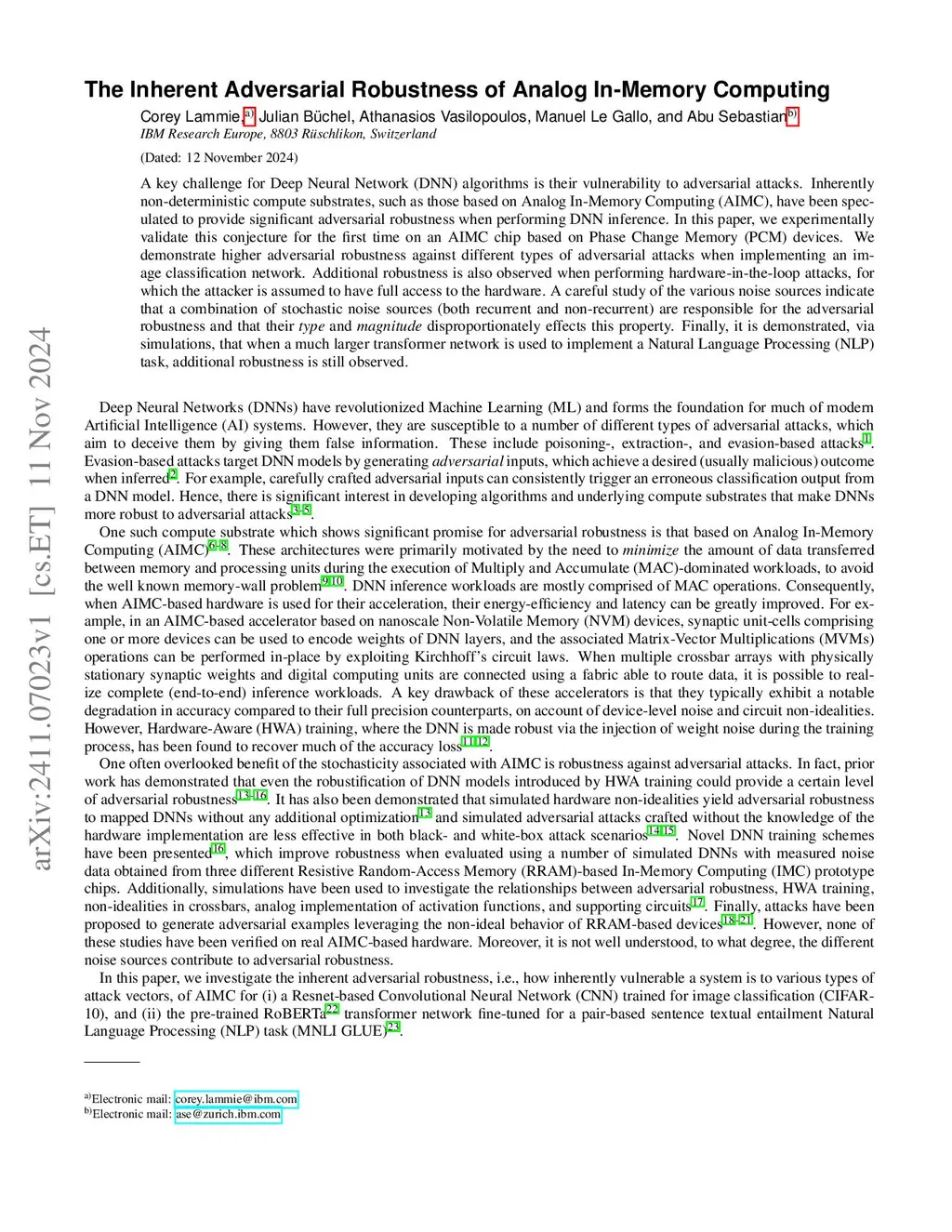 The Inherent Adversarial Robustness of Analog In-Memory Computing