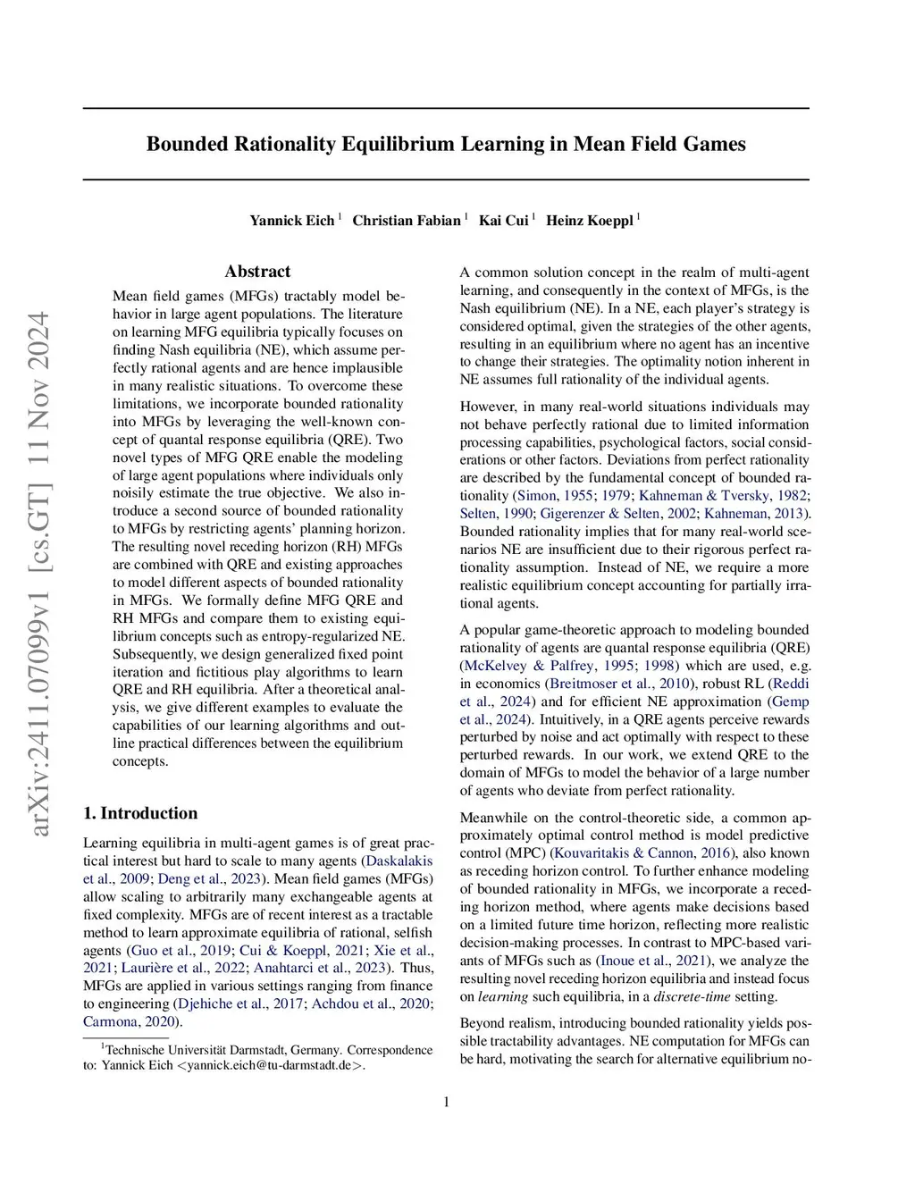 Mean field games (MFGs) tractably model behavior in large agent populations. The literature on learning MFG equilibria typically focuses on finding Nash equilibria (NE), which assume perfectly rational agents and are hence implausible in many realistic situations. To overcome these limitations, we incorporate bounded rationality into MFGs by leveraging the well-known concept of quantal response equilibria (QRE). Two novel types of MFG QRE enable the modeling of large agent populations where individuals only noisily estimate the true objective. We also introduce a second source of bounded rationality to MFGs by restricting agents' planning horizon. The resulting novel receding horizon (RH) MFGs are combined with QRE and existing approaches to model different aspects of bounded rationality in MFGs. We formally define MFG QRE and RH MFGs and compare them to existing equilibrium concepts such as entropy-regularized NE. Subsequently, we design generalized fixed point iteration and fictitious play algorithms to learn QRE and RH equilibria. After a theoretical analysis, we give different examples to evaluate the capabilities of our learning algorithms and outline practical differences between the equilibrium concepts.