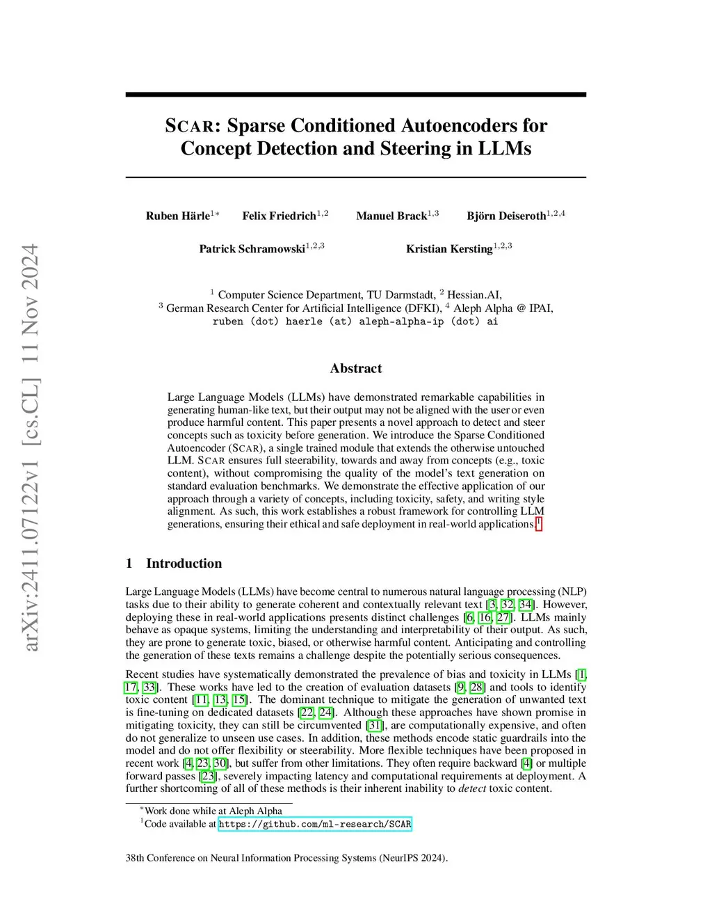Large Language Models (LLMs) have demonstrated remarkable capabilities in generating human-like text, but their output may not be aligned with the user or even produce harmful content. This paper presents a novel approach to detect and steer concepts such as toxicity before generation. We introduce the Sparse Conditioned Autoencoder (SCAR), a single trained module that extends the otherwise untouched LLM. SCAR ensures full steerability, towards and away from concepts (e.g., toxic content), without compromising the quality of the model's text generation on standard evaluation benchmarks. We demonstrate the effective application of our approach through a variety of concepts, including toxicity, safety, and writing style alignment. As such, this work establishes a robust framework for controlling LLM generations, ensuring their ethical and safe deployment in real-world applications.