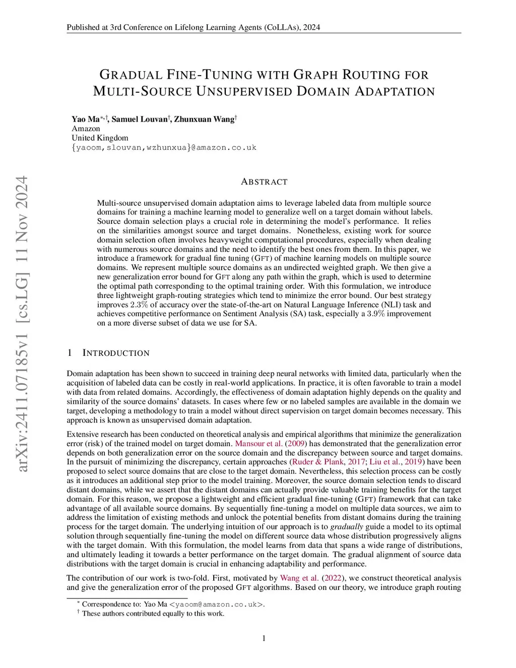 Multi-source unsupervised domain adaptation aims to leverage labeled data from multiple source domains for training a machine learning model to generalize well on a target domain without labels. Source domain selection plays a crucial role in determining the model's performance. It relies on the similarities amongst source and target domains. Nonetheless, existing work for source domain selection often involves heavyweight computational procedures, especially when dealing with numerous source domains and the need to identify the best ones from them. In this paper, we introduce a framework for gradual fine tuning (GFT) of machine learning models on multiple source domains. We represent multiple source domains as an undirected weighted graph. We then give a new generalization error bound for GFT along any path within the graph, which is used to determine the optimal path corresponding to the optimal training order. With this formulation, we introduce three lightweight graph-routing strategies which tend to minimize the error bound. Our best strategy improves of accuracy over the state-of-the-art on Natural Language Inference (NLI) task and achieves competitive performance on Sentiment Analysis (SA) task, especially a improvement on a more diverse subset of data we use for SA.