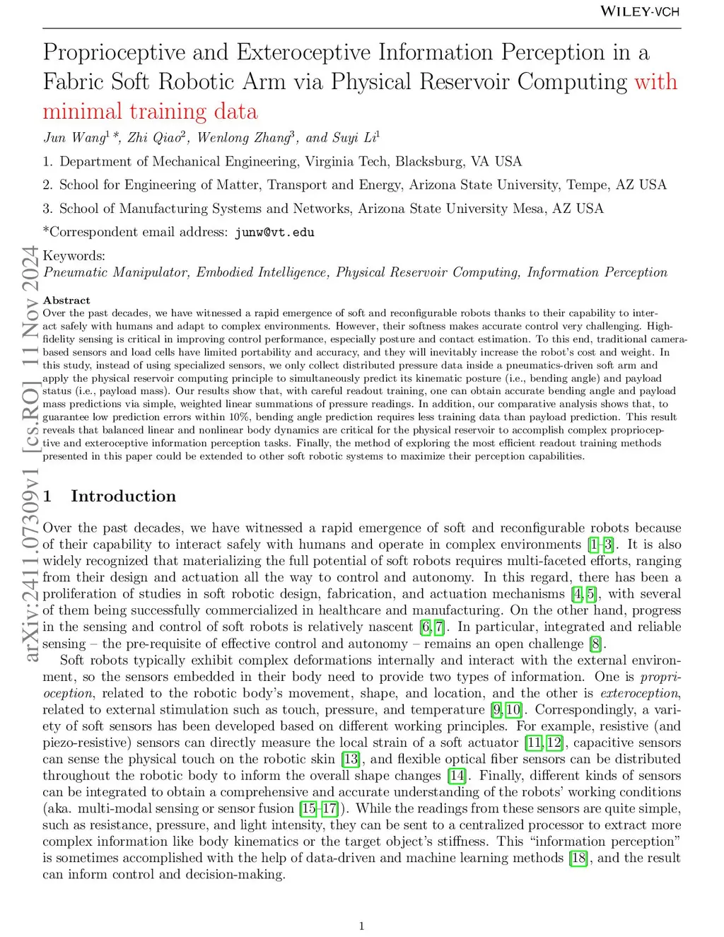 Robotic Arm via Physical Reservoir Computing with minimal training data