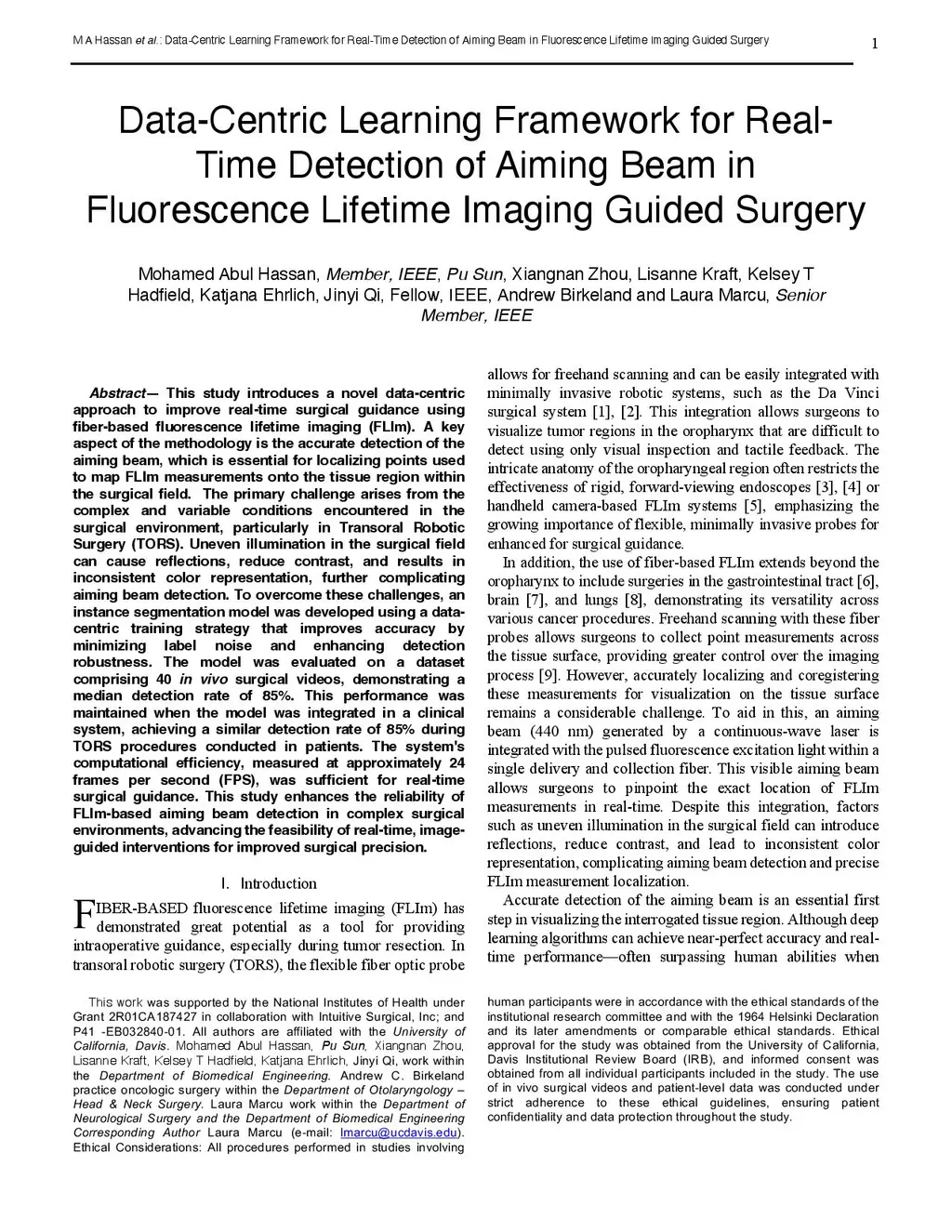 This study introduces a novel data-centric approach to improve real-time surgical guidance using fiber-based fluorescence lifetime imaging (FLIm). A key aspect of the methodology is the accurate detection of the aiming beam, which is essential for localizing points used to map FLIm measurements onto the tissue region within the surgical field. The primary challenge arises from the complex and variable conditions encountered in the surgical environment, particularly in Transoral Robotic Surgery (TORS). Uneven illumination in the surgical field can cause reflections, reduce contrast, and results in inconsistent color representation, further complicating aiming beam detection. To overcome these challenges, an instance segmentation model was developed using a data-centric training strategy that improves accuracy by minimizing label noise and enhancing detection robustness. The model was evaluated on a dataset comprising 40 in vivo surgical videos, demonstrating a median detection rate of 85%. This performance was maintained when the model was integrated in a clinical system, achieving a similar detection rate of 85% during TORS procedures conducted in patients. The system's computational efficiency, measured at approximately 24 frames per second (FPS), was sufficient for real-time surgical guidance. This study enhances the reliability of FLIm-based aiming beam detection in complex surgical environments, advancing the feasibility of real-time, image-guided interventions for improved surgical precision