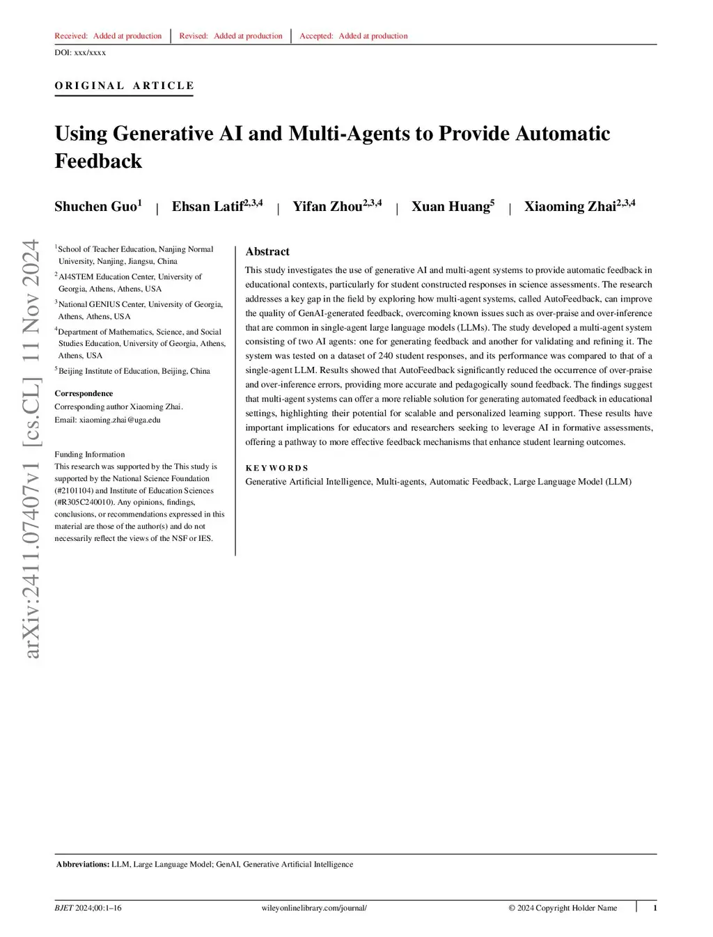 Using Generative AI and Multi-Agents to Provide Automatic Feedback