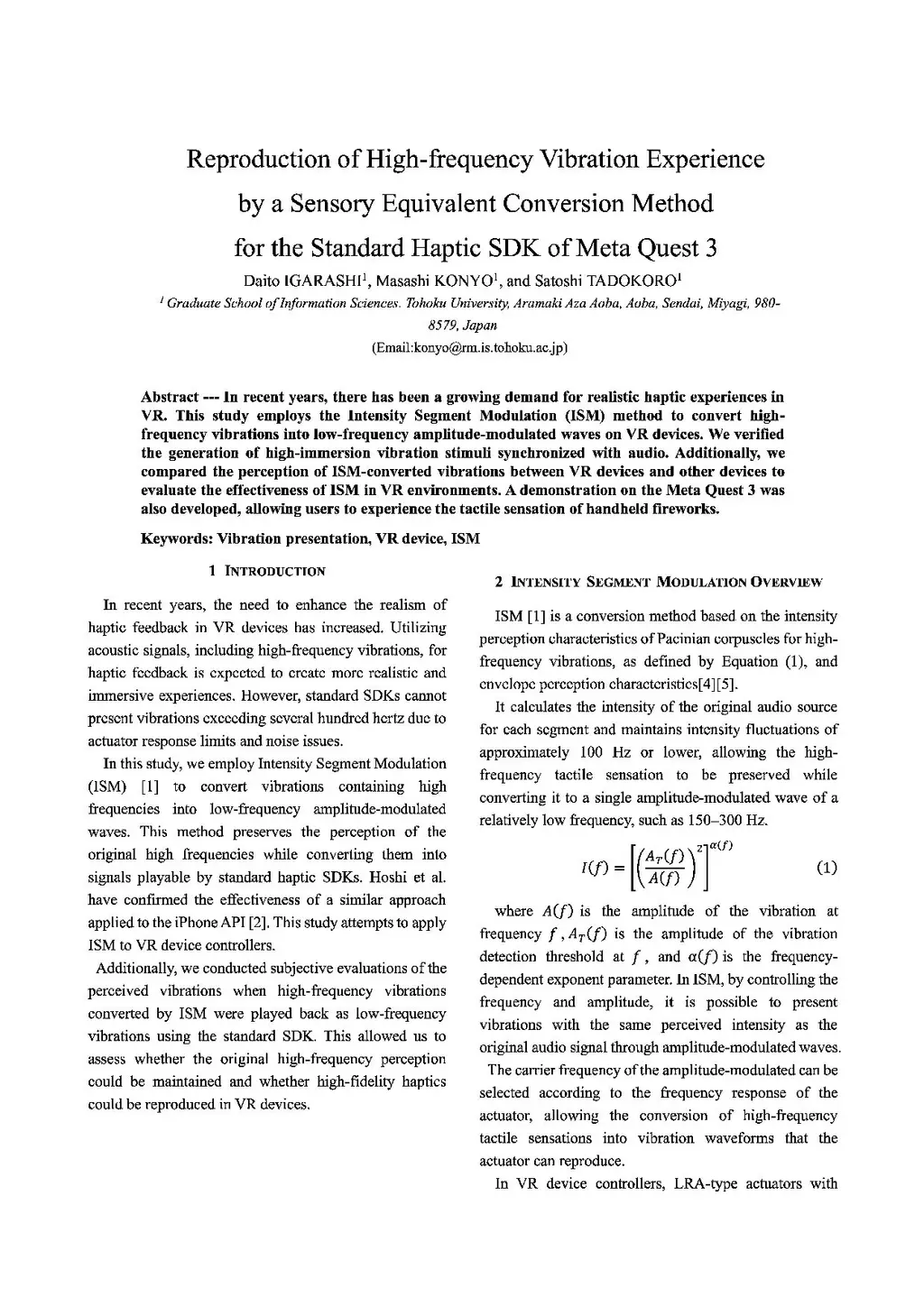In recent years, there has been a growing demand for realistic haptic experiences in VR. This study employs the Intensity Segment Modulation (ISM) method to convert high-frequency vibrations into low-frequency amplitude-modulated waves on VR devices. We verified the generation of high-immersion vibration stimuli synchronized with audio. Additionally, we compared the perception of ISM-converted vibrations between VR devices and other devices to evaluate the effectiveness of ISM in VR environments. A demonstration on the Meta Quest 3 was also developed, allowing users to experience the tactile sensation of handheld fireworks.