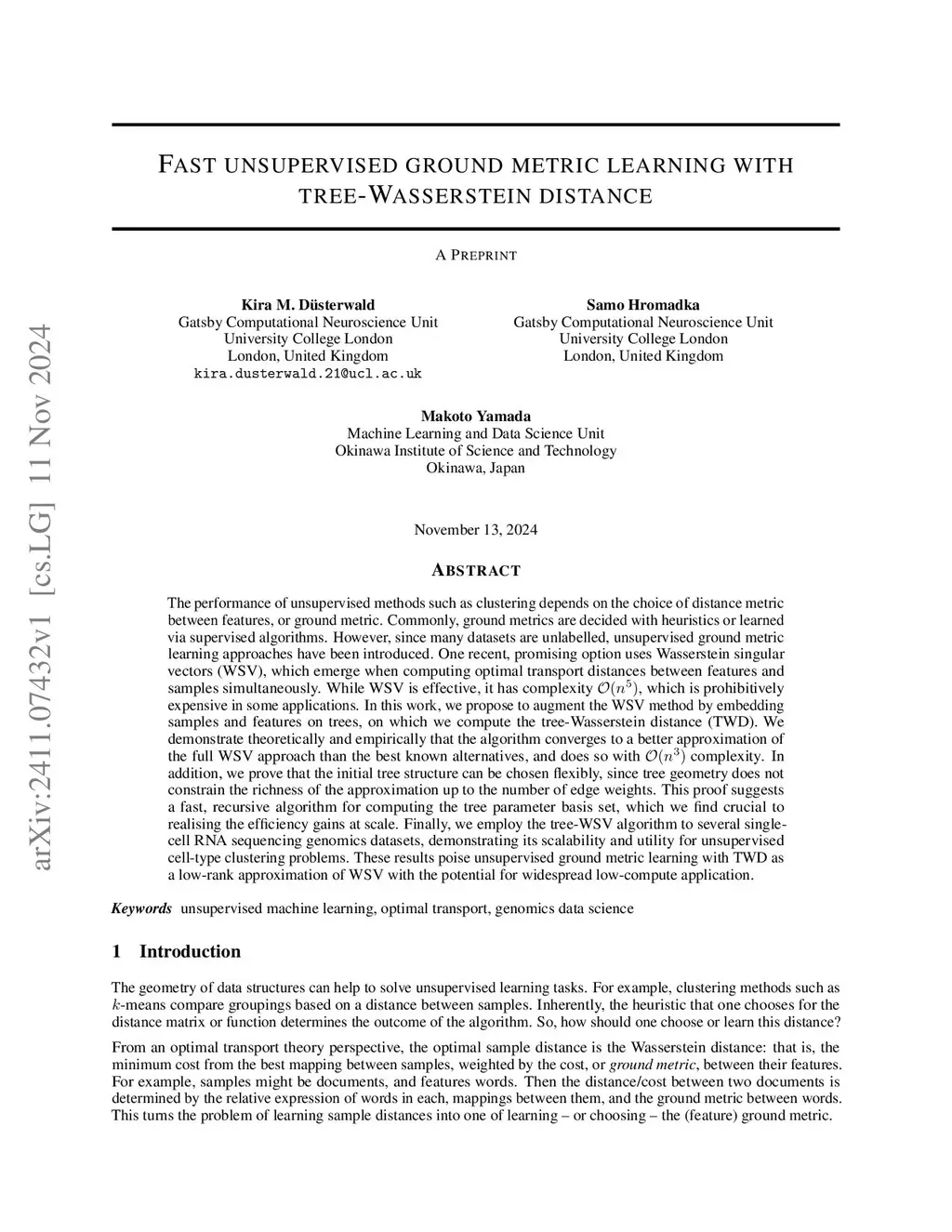 The performance of unsupervised methods such as clustering depends on the choice of distance metric between features, or ground metric. Commonly, ground metrics are decided with heuristics or learned via supervised algorithms. However, since many interesting datasets are unlabelled, unsupervised ground metric learning approaches have been introduced. One promising option employs Wasserstein singular vectors (WSVs), which emerge when computing optimal transport distances between features and samples simultaneously. WSVs are effective, but can be prohibitively computationally expensive in some applications: for samples and features. In this work, we propose to augment the WSV method by embedding samples and features on trees, on which we compute the tree-Wasserstein distance (TWD). We demonstrate theoretically and empirically that the algorithm converges to a better approximation of the standard WSV approach than the best known alternatives, and does so with complexity. In addition, we prove that the initial tree structure can be chosen flexibly, since tree geometry does not constrain the richness of the approximation up to the number of edge weights. This proof suggests a fast and recursive algorithm for computing the tree parameter basis set, which we find crucial to realising the efficiency gains at scale. Finally, we employ the tree-WSV algorithm to several single-cell RNA sequencing genomics datasets, demonstrating its scalability and utility for unsupervised cell-type clustering problems. These results poise unsupervised ground metric learning with TWD as a low-rank approximation of WSV with the potential for widespread application.