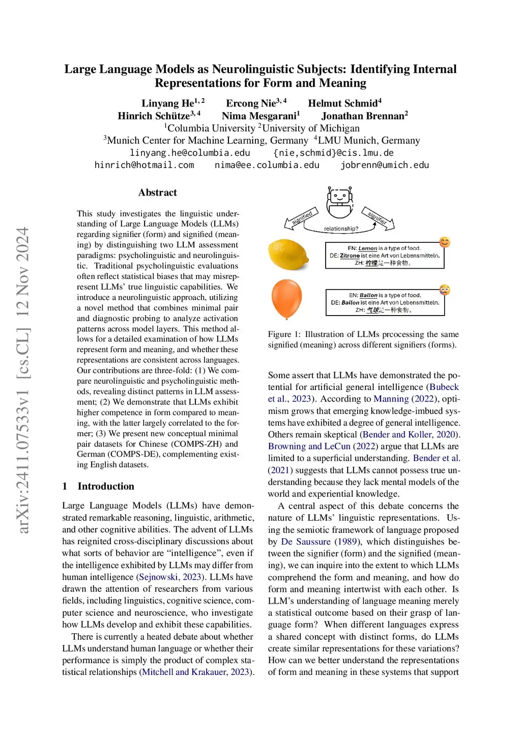 This study investigates the linguistic understanding of Large Language Models (LLMs) regarding signifier (form) and signified (meaning) by distinguishing two LLM assessment paradigms: psycholinguistic and neurolinguistic. Traditional psycholinguistic evaluations often reflect statistical rules that may not accurately represent LLMs' true linguistic competence. We introduce a neurolinguistic approach, utilizing a novel method that combines minimal pair and diagnostic probing to analyze activation patterns across model layers. This method allows for a detailed examination of how LLMs represent form and meaning, and whether these representations are consistent across languages. We found: (1) Psycholinguistic and neurolinguistic methods reveal that language performance and competence are distinct; (2) Direct probability measurement may not accurately assess linguistic competence; (3) Instruction tuning won't change much competence but improve performance; (4) LLMs exhibit higher competence and performance in form compared to meaning. Additionally, we introduce new conceptual minimal pair datasets for Chinese (COMPS-ZH) and German (COMPS-DE), complementing existing English datasets.