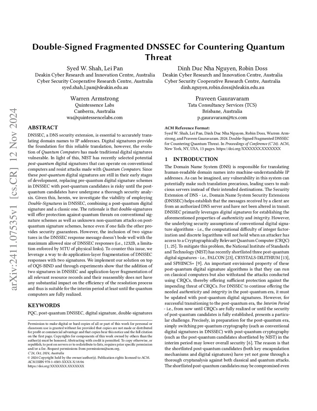 Double-Signed Fragmented DNSSEC for Countering Quantum Threat