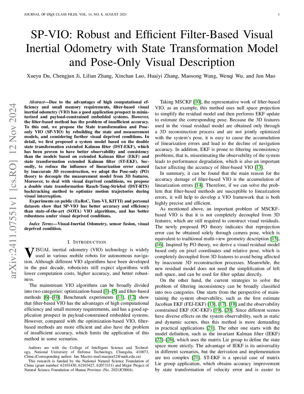 SP-VIO: Robust and Efficient Filter-Based Visual Inertial Odometry with State Transformation Model and Pose-Only Visual Description