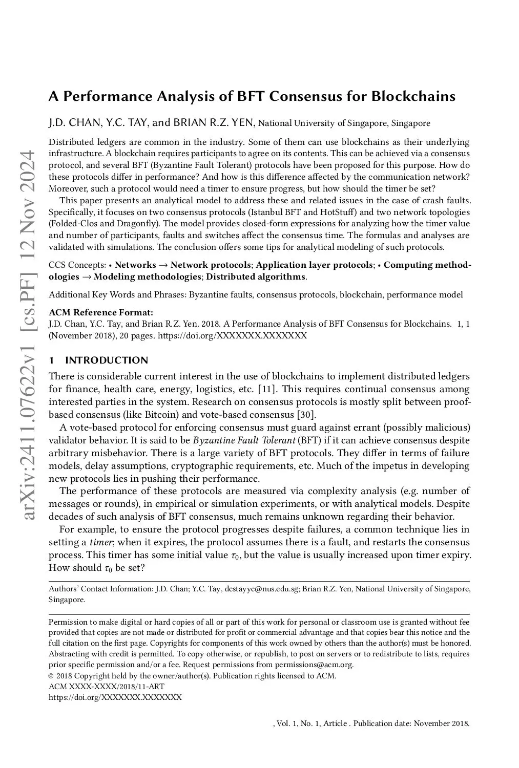 Distributed ledgers are common in the industry. Some of them can use blockchains as their underlying infrastructure. A blockchain requires participants to agree on its contents. This can be achieved via a consensus protocol, and several BFT (Byzantine Fault Tolerant) protocols have been proposed for this purpose. How do these protocols differ in performance? And how is this difference affected by the communication network? Moreover, such a protocol would need a timer to ensure progress, but how should the timer be set? This paper presents an analytical model to address these and related issues in the case of crash faults. Specifically, it focuses on two consensus protocols (Istanbul BFT and HotStuff) and two network topologies (Folded-Clos and Dragonfly). The model provides closed-form expressions for analyzing how the timer value and number of participants, faults and switches affect the consensus time. The formulas and analyses are validated with simulations. The conclusion offers some tips for analytical modeling of such protocols.