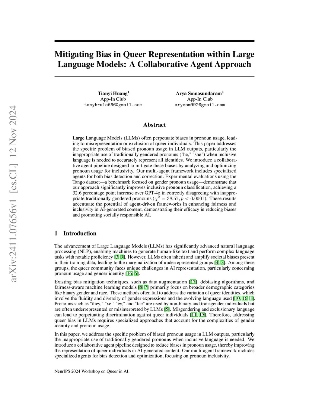 Large Language Models (LLMs) often perpetuate biases in pronoun usage, leading to misrepresentation or exclusion of queer individuals. This paper addresses the specific problem of biased pronoun usage in LLM outputs, particularly the inappropriate use of traditionally gendered pronouns ("he," "she") when inclusive language is needed to accurately represent all identities. We introduce a collaborative agent pipeline designed to mitigate these biases by analyzing and optimizing pronoun usage for inclusivity. Our multi-agent framework includes specialized agents for both bias detection and correction. Experimental evaluations using the Tango dataset-a benchmark focused on gender pronoun usage-demonstrate that our approach significantly improves inclusive pronoun classification, achieving a 32.6 percentage point increase over GPT-4o in correctly disagreeing with inappropriate traditionally gendered pronouns (χ2=38.57,p<0.0001)(\chi^2 = 38.57, p < 0.0001). These results accentuate the potential of agent-driven frameworks in enhancing fairness and inclusivity in AI-generated content, demonstrating their efficacy in reducing biases and promoting socially responsible AI.