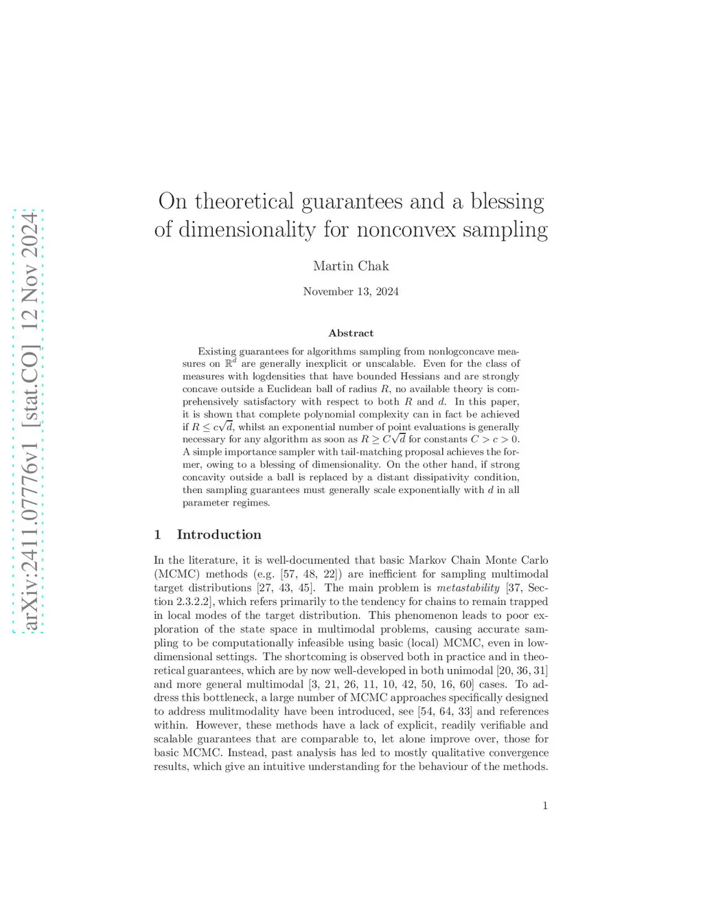 Existing guarantees for algorithms sampling from nonlogconcave measures on are generally inexplicit or unscalable. Even for the class of measures with logdensities that have bounded Hessians and are strongly concave outside a Euclidean ball of radius , no available theory is comprehensively satisfactory with respect to both and . In this paper, it is shown that complete polynomial complexity can in fact be achieved if , whilst an exponential number of point evaluations is generally necessary for any algorithm as soon as for constants . A simple importance sampler with tail-matching proposal achieves the former, owing to a blessing of dimensionality. On the other hand, if strong concavity outside a ball is replaced by a distant dissipativity condition, then sampling guarantees must generally scale exponentially with in all parameter regimes.