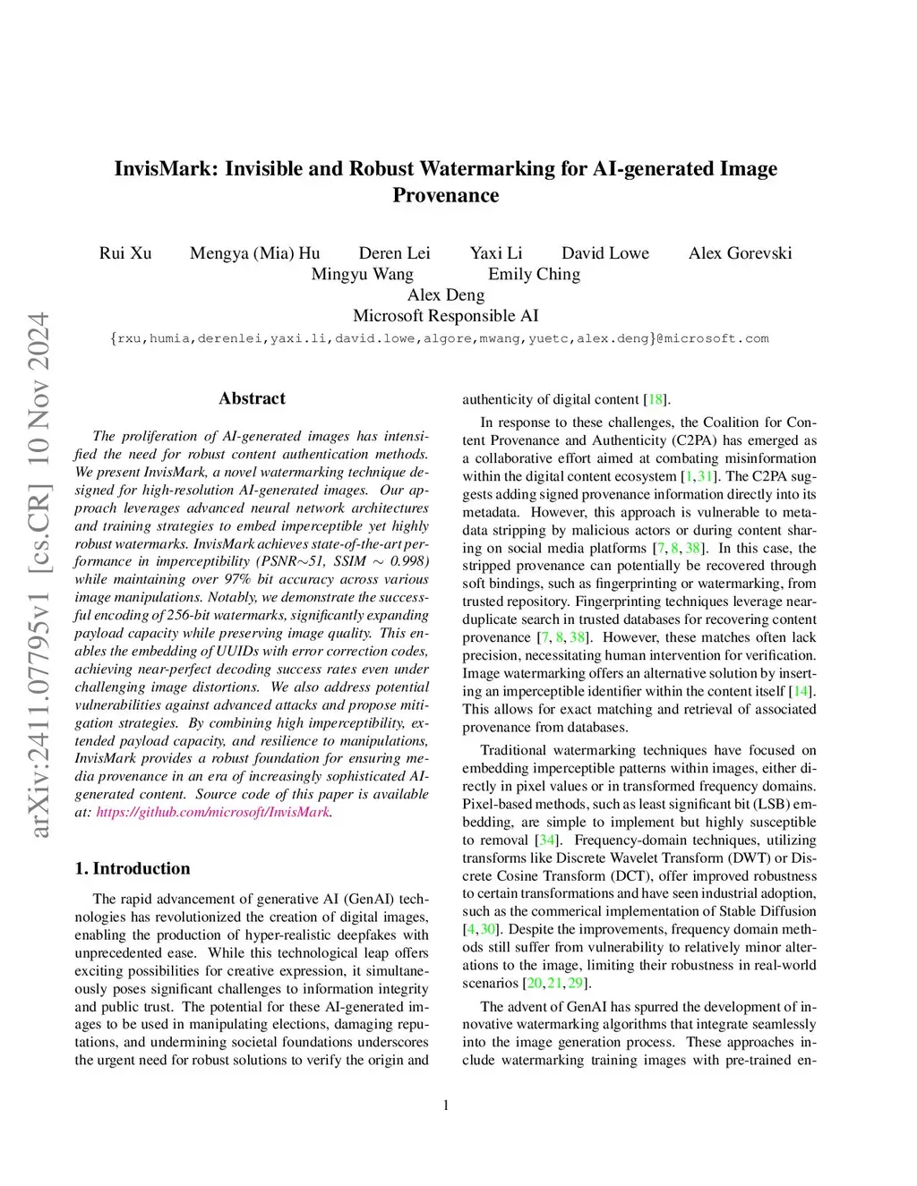 The proliferation of AI-generated images has intensified the need for robust content authentication methods. We present InvisMark, a novel watermarking technique designed for high-resolution AI-generated images. Our approach leverages advanced neural network architectures and training strategies to embed imperceptible yet highly robust watermarks. InvisMark achieves state-of-the-art performance in imperceptibility (PSNR51, SSIM 0.998) while maintaining over 97\% bit accuracy across various image manipulations. Notably, we demonstrate the successful encoding of 256-bit watermarks, significantly expanding payload capacity while preserving image quality. This enables the embedding of UUIDs with error correction codes, achieving near-perfect decoding success rates even under challenging image distortions. We also address potential vulnerabilities against advanced attacks and propose mitigation strategies. By combining high imperceptibility, extended payload capacity, and resilience to manipulations, InvisMark provides a robust foundation for ensuring media provenance in an era of increasingly sophisticated AI-generated content. Source code of this paper is available at: https://github.com/microsoft/InvisMark.