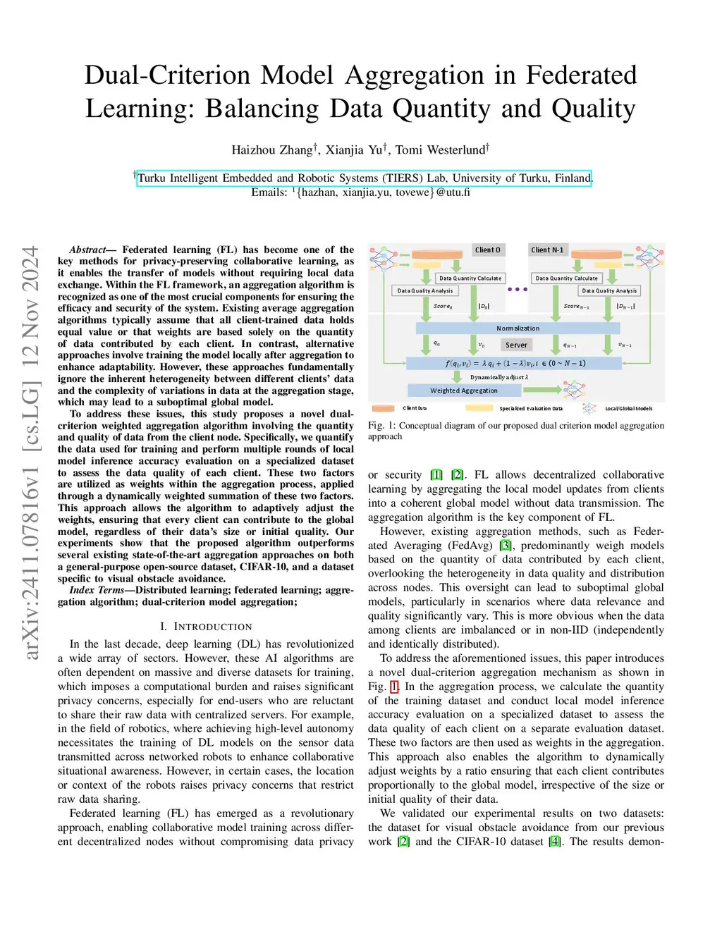 Federated learning (FL) has become one of the key methods for privacy-preserving collaborative learning, as it enables the transfer of models without requiring local data exchange. Within the FL framework, an aggregation algorithm is recognized as one of the most crucial components for ensuring the efficacy and security of the system. Existing average aggregation algorithms typically assume that all client-trained data holds equal value or that weights are based solely on the quantity of data contributed by each client. In contrast, alternative approaches involve training the model locally after aggregation to enhance adaptability. However, these approaches fundamentally ignore the inherent heterogeneity between different clients' data and the complexity of variations in data at the aggregation stage, which may lead to a suboptimal global model. To address these issues, this study proposes a novel dual-criterion weighted aggregation algorithm involving the quantity and quality of data from the client node. Specifically, we quantify the data used for training and perform multiple rounds of local model inference accuracy evaluation on a specialized dataset to assess the data quality of each client. These two factors are utilized as weights within the aggregation process, applied through a dynamically weighted summation of these two factors. This approach allows the algorithm to adaptively adjust the weights, ensuring that every client can contribute to the global model, regardless of their data's size or initial quality. Our experiments show that the proposed algorithm outperforms several existing state-of-the-art aggregation approaches on both a general-purpose open-source dataset, CIFAR-10, and a dataset specific to visual obstacle avoidance.