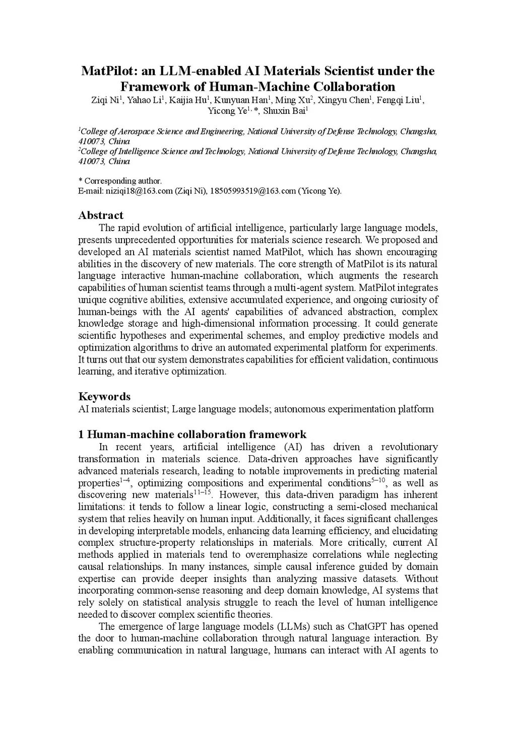 The rapid evolution of artificial intelligence, particularly large language models, presents unprecedented opportunities for materials science research. We proposed and developed an AI materials scientist named MatPilot, which has shown encouraging abilities in the discovery of new materials. The core strength of MatPilot is its natural language interactive human-machine collaboration, which augments the research capabilities of human scientist teams through a multi-agent system. MatPilot integrates unique cognitive abilities, extensive accumulated experience, and ongoing curiosity of human-beings with the AI agents' capabilities of advanced abstraction, complex knowledge storage and high-dimensional information processing. It could generate scientific hypotheses and experimental schemes, and employ predictive models and optimization algorithms to drive an automated experimental platform for experiments. It turns out that our system demonstrates capabilities for efficient validation, continuous learning, and iterative optimization.
