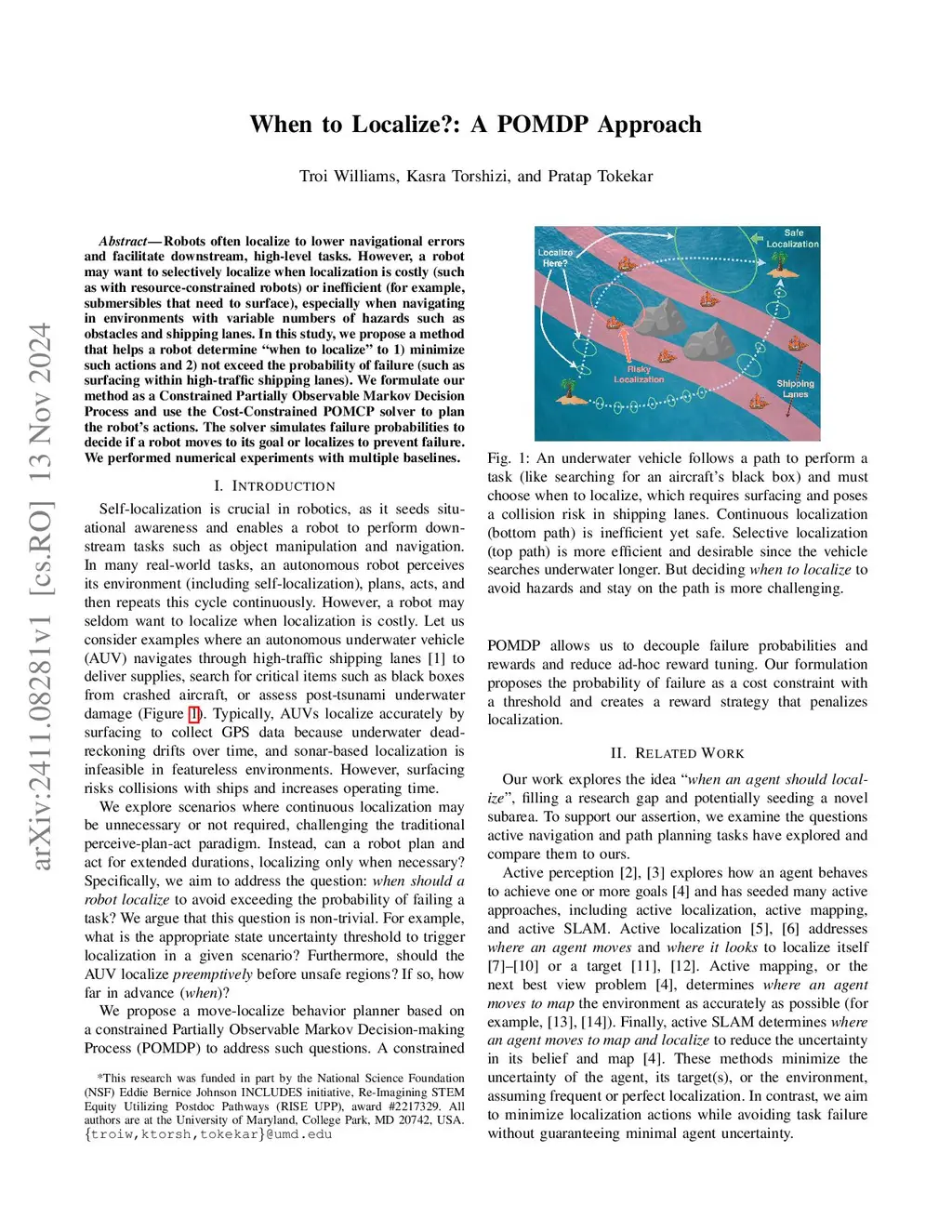 Robots often localize to lower navigational errors and facilitate downstream, high-level tasks. However, a robot may want to selectively localize when localization is costly (such as with resource-constrained robots) or inefficient (for example, submersibles that need to surface), especially when navigating in environments with variable numbers of hazards such as obstacles and shipping lanes. In this study, we propose a method that helps a robot determine ``when to localize'' to 1) minimize such actions and 2) not exceed the probability of failure (such as surfacing within high-traffic shipping lanes). We formulate our method as a Constrained Partially Observable Markov Decision Process and use the Cost-Constrained POMCP solver to plan the robot's actions. The solver simulates failure probabilities to decide if a robot moves to its goal or localizes to prevent failure. We performed numerical experiments with multiple baselines.