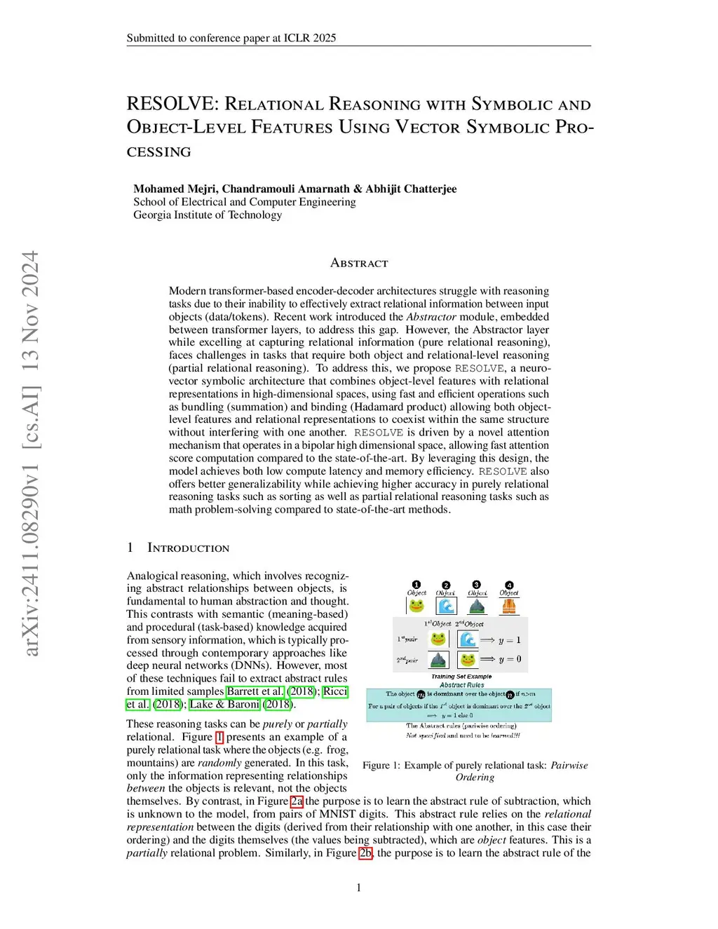 Modern transformer-based encoder-decoder architectures struggle with reasoning tasks due to their inability to effectively extract relational information between input objects (data/tokens). Recent work introduced the Abstractor module, embedded between transformer layers, to address this gap. However, the Abstractor layer while excelling at capturing relational information (pure relational reasoning), faces challenges in tasks that require both object and relational-level reasoning (partial relational reasoning). To address this, we propose RESOLVE, a neuro-vector symbolic architecture that combines object-level features with relational representations in high-dimensional spaces, using fast and efficient operations such as bundling (summation) and binding (Hadamard product) allowing both object-level features and relational representations to coexist within the same structure without interfering with one another. RESOLVE is driven by a novel attention mechanism that operates in a bipolar high dimensional space, allowing fast attention score computation compared to the state-of-the-art. By leveraging this design, the model achieves both low compute latency and memory efficiency. RESOLVE also offers better generalizability while achieving higher accuracy in purely relational reasoning tasks such as sorting as well as partial relational reasoning tasks such as math problem-solving compared to state-of-the-art methods.