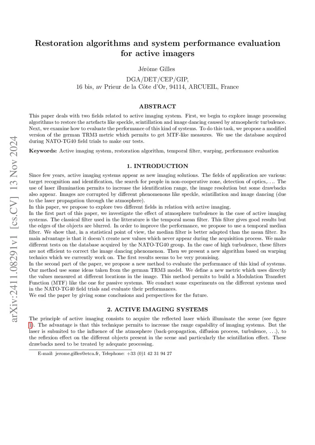 This paper deals with two fields related to active imaging system. First, we begin to explore image processing algorithms to restore the artefacts like speckle, scintillation and image dancing caused by atmospheric turbulence. Next, we examine how to evaluate the performance of this kind of systems. To do this task, we propose a modified version of the german TRM3 metric which permits to get MTF-like measures. We use the database acquired during NATO-TG40 field trials to make our tests.