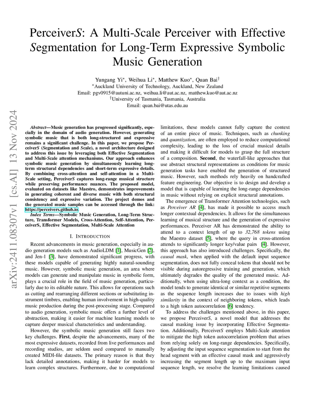 AI-based music generation has made significant progress in recent years. However, generating symbolic music that is both long-structured and expressive remains a significant challenge. In this paper, we propose PerceiverS (Segmentation and Scale), a novel architecture designed to address this issue by leveraging both Effective Segmentation and Multi-Scale attention mechanisms. Our approach enhances symbolic music generation by simultaneously learning long-term structural dependencies and short-term expressive details. By combining cross-attention and self-attention in a Multi-Scale setting, PerceiverS captures long-range musical structure while preserving performance nuances. The proposed model has been evaluated using the Maestro dataset and has demonstrated improvements in generating coherent and diverse music, characterized by both structural consistency and expressive variation. The project demos and the generated music samples can be accessed through the link:this https URL.