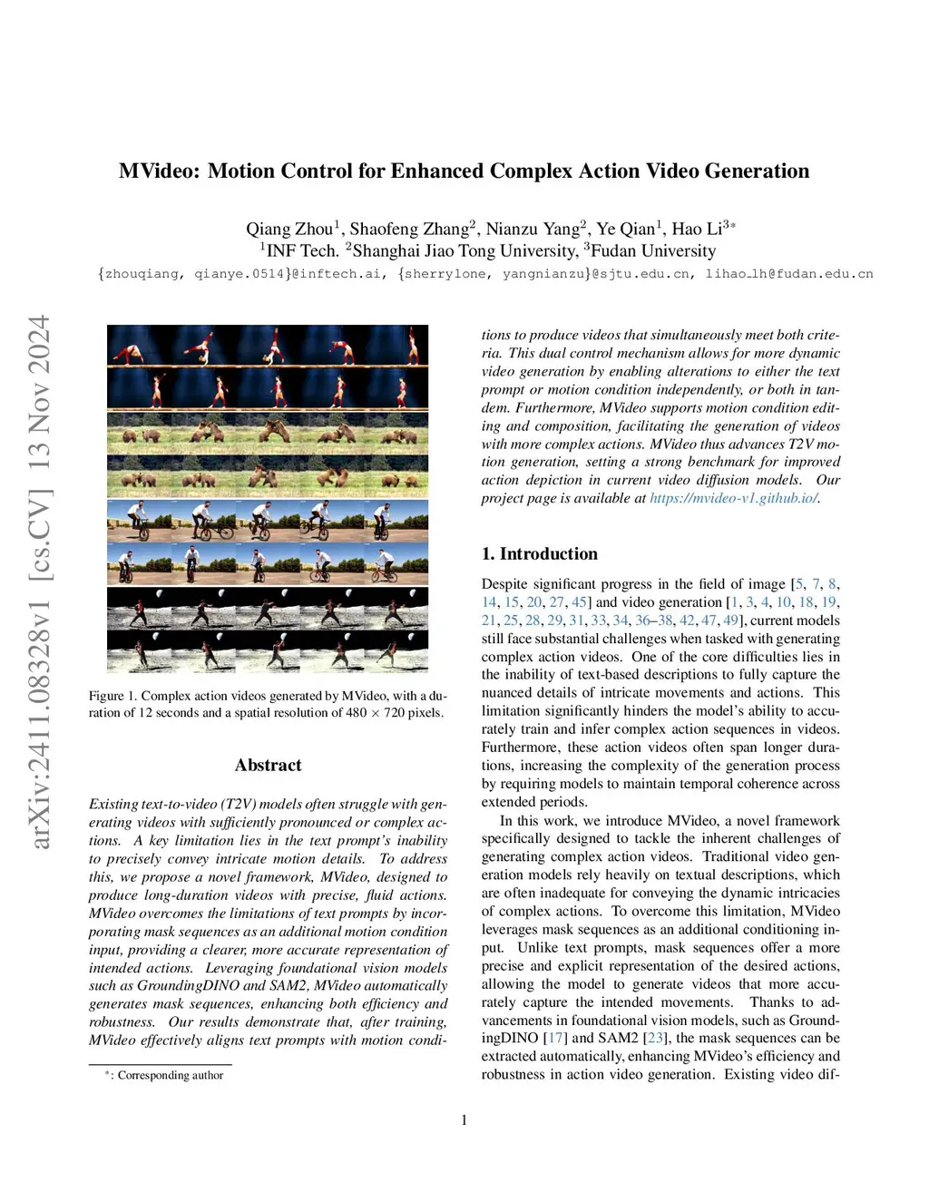 Existing text-to-video (T2V) models often struggle with generating videos with sufficiently pronounced or complex actions. A key limitation lies in the text prompt's inability to precisely convey intricate motion details. To address this, we propose a novel framework, MVideo, designed to produce long-duration videos with precise, fluid actions. MVideo overcomes the limitations of text prompts by incorporating mask sequences as an additional motion condition input, providing a clearer, more accurate representation of intended actions. Leveraging foundational vision models such as GroundingDINO and SAM2, MVideo automatically generates mask sequences, enhancing both efficiency and robustness. Our results demonstrate that, after training, MVideo effectively aligns text prompts with motion conditions to produce videos that simultaneously meet both criteria. This dual control mechanism allows for more dynamic video generation by enabling alterations to either the text prompt or motion condition independently, or both in tandem. Furthermore, MVideo supports motion condition editing and composition, facilitating the generation of videos with more complex actions. MVideo thus advances T2V motion generation, setting a strong benchmark for improved action depiction in current video diffusion models. Our project page is available at https://mvideo-v1.github.io/.
