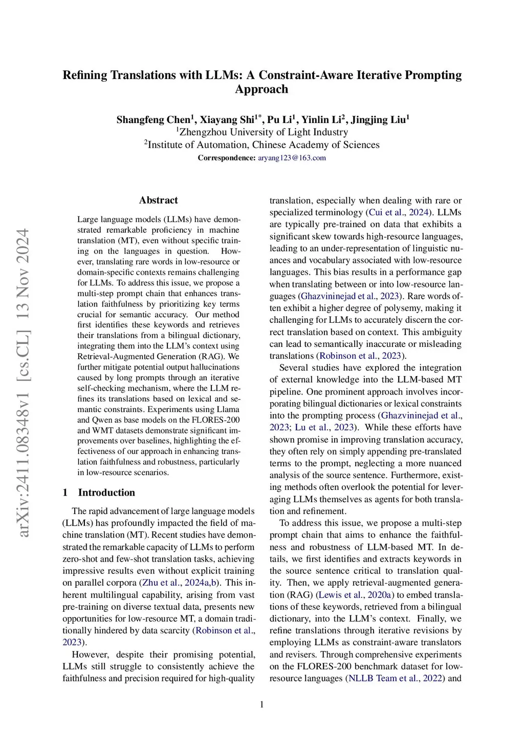 Large language models (LLMs) have demonstrated remarkable proficiency in machine translation (MT), even without specific training on the languages in question. However, translating rare words in low-resource or domain-specific contexts remains challenging for LLMs. To address this issue, we propose a multi-step prompt chain that enhances translation faithfulness by prioritizing key terms crucial for semantic accuracy. Our method first identifies these keywords and retrieves their translations from a bilingual dictionary, integrating them into the LLM's context using Retrieval-Augmented Generation (RAG). We further mitigate potential output hallucinations caused by long prompts through an iterative self-checking mechanism, where the LLM refines its translations based on lexical and semantic constraints. Experiments using Llama and Qwen as base models on the FLORES-200 and WMT datasets demonstrate significant improvements over baselines, highlighting the effectiveness of our approach in enhancing translation faithfulness and robustness, particularly in low-resource scenarios.
