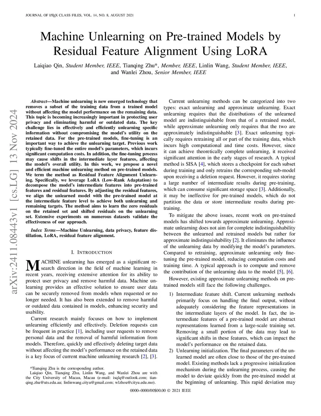 Machine Unlearning on Pre-trained Models by Residual Feature Alignment