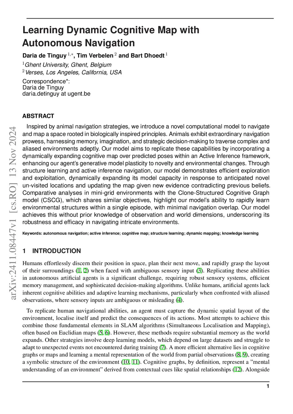 Inspired by animal navigation strategies, we introduce a novel computational model to navigate and map a space rooted in biologically inspired principles. Animals exhibit extraordinary navigation prowess, harnessing memory, imagination, and strategic decision-making to traverse complex and aliased environments adeptly. Our model aims to replicate these capabilities by incorporating a dynamically expanding cognitive map over predicted poses within an Active Inference framework, enhancing our agent's generative model plasticity to novelty and environmental changes. Through structure learning and active inference navigation, our model demonstrates efficient exploration and exploitation, dynamically expanding its model capacity in response to anticipated novel un-visited locations and updating the map given new evidence contradicting previous beliefs. Comparative analyses in mini-grid environments with the Clone-Structured Cognitive Graph model (CSCG), which shares similar objectives, highlight our model's ability to rapidly learn environmental structures within a single episode, with minimal navigation overlap. Our model achieves this without prior knowledge of observation and world dimensions, underscoring its robustness and efficacy in navigating intricate environments.