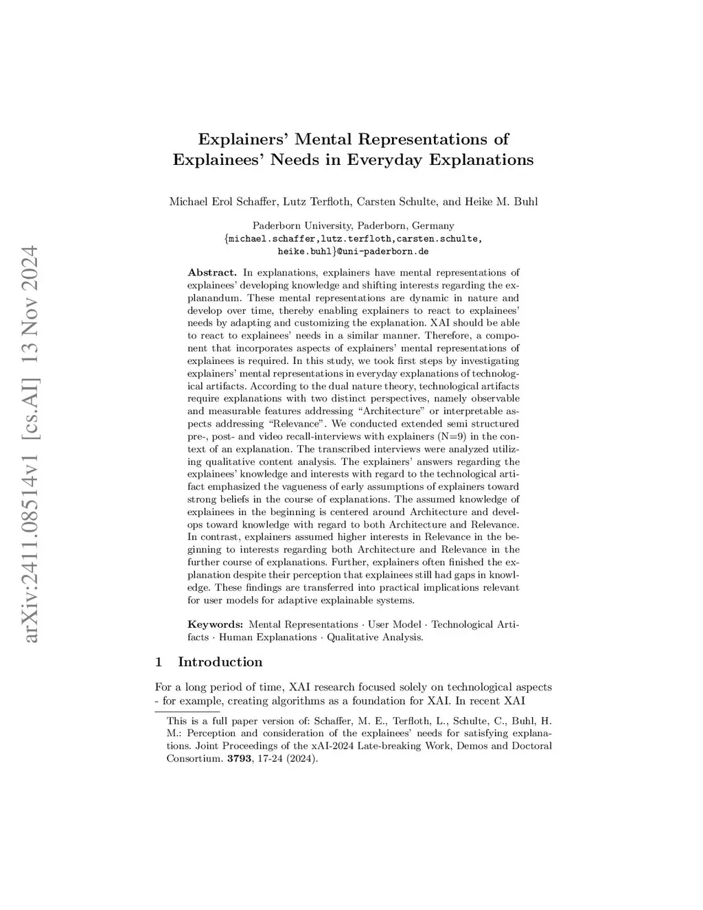 In explanations, explainers have mental representations of explainees' developing knowledge and shifting interests regarding the explanandum. These mental representations are dynamic in nature and develop over time, thereby enabling explainers to react to explainees' needs by adapting and customizing the explanation. XAI should be able to react to explainees' needs in a similar manner. Therefore, a component that incorporates aspects of explainers' mental representations of explainees is required. In this study, we took first steps by investigating explainers' mental representations in everyday explanations of technological artifacts. According to the dual nature theory, technological artifacts require explanations with two distinct perspectives, namely observable and measurable features addressing "Architecture" or interpretable aspects addressing "Relevance". We conducted extended semi structured pre-, post- and video recall-interviews with explainers (N=9) in the context of an explanation. The transcribed interviews were analyzed utilizing qualitative content analysis. The explainers' answers regarding the explainees' knowledge and interests with regard to the technological artifact emphasized the vagueness of early assumptions of explainers toward strong beliefs in the course of explanations. The assumed knowledge of explainees in the beginning is centered around Architecture and develops toward knowledge with regard to both Architecture and Relevance. In contrast, explainers assumed higher interests in Relevance in the beginning to interests regarding both Architecture and Relevance in the further course of explanations. Further, explainers often finished the explanation despite their perception that explainees still had gaps in knowledge. These findings are transferred into practical implications relevant for user models for adaptive explainable systems.