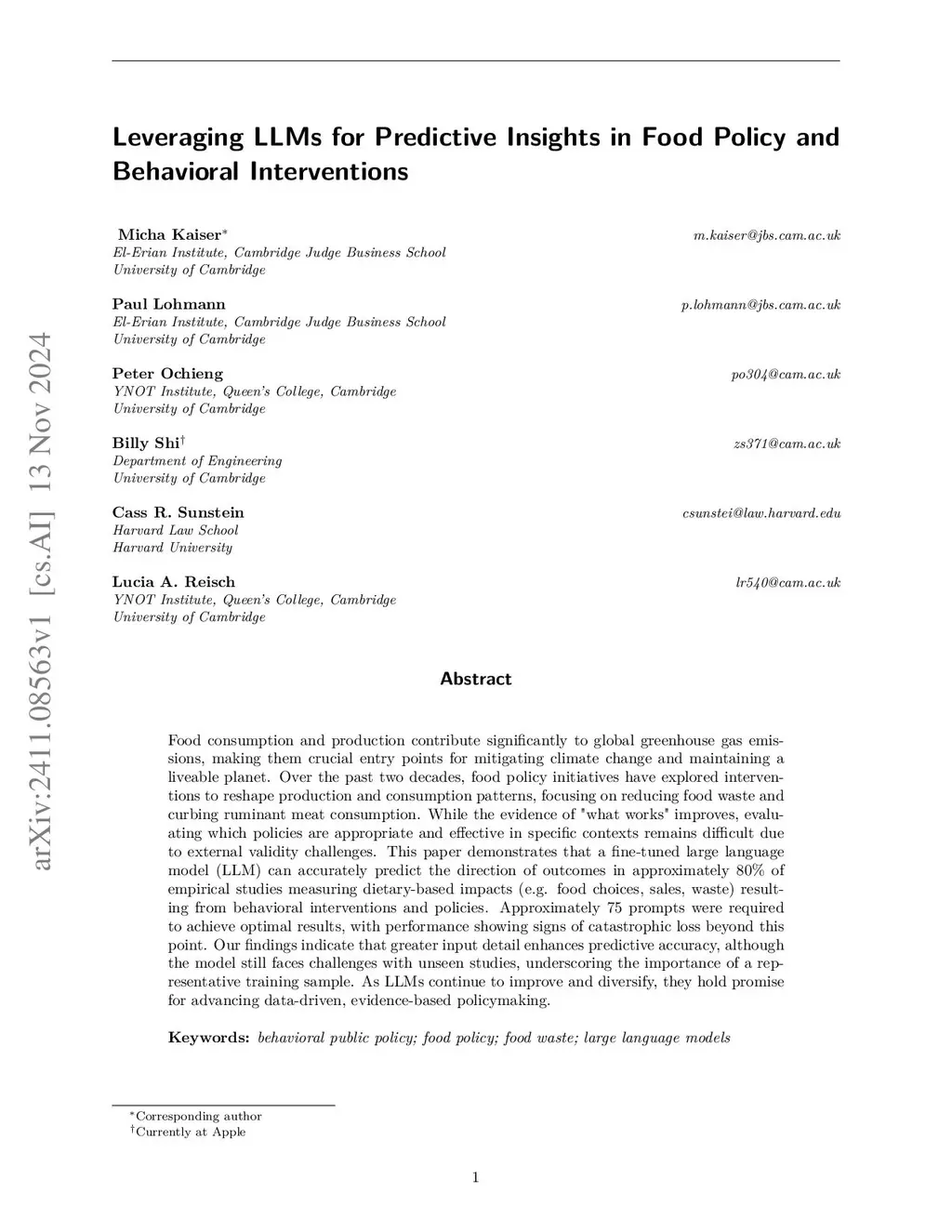 Food consumption and production contribute significantly to global greenhouse gas emissions, making them crucial entry points for mitigating climate change and maintaining a liveable planet. Over the past two decades, food policy initiatives have explored interventions to reshape production and consumption patterns, focusing on reducing food waste and curbing ruminant meat consumption. While the evidence of "what works" improves, evaluating which policies are appropriate and effective in specific contexts remains difficult due to external validity challenges. This paper demonstrates that a fine-tuned large language model (LLM) can accurately predict the direction of outcomes in approximately 80\% of empirical studies measuring dietary-based impacts (e.g. food choices, sales, waste) resulting from behavioral interventions and policies. Approximately 75 prompts were required to achieve optimal results, with performance showing signs of catastrophic loss beyond this point. Our findings indicate that greater input detail enhances predictive accuracy, although the model still faces challenges with unseen studies, underscoring the importance of a representative training sample. As LLMs continue to improve and diversify, they hold promise for advancing data-driven, evidence-based policymaking.