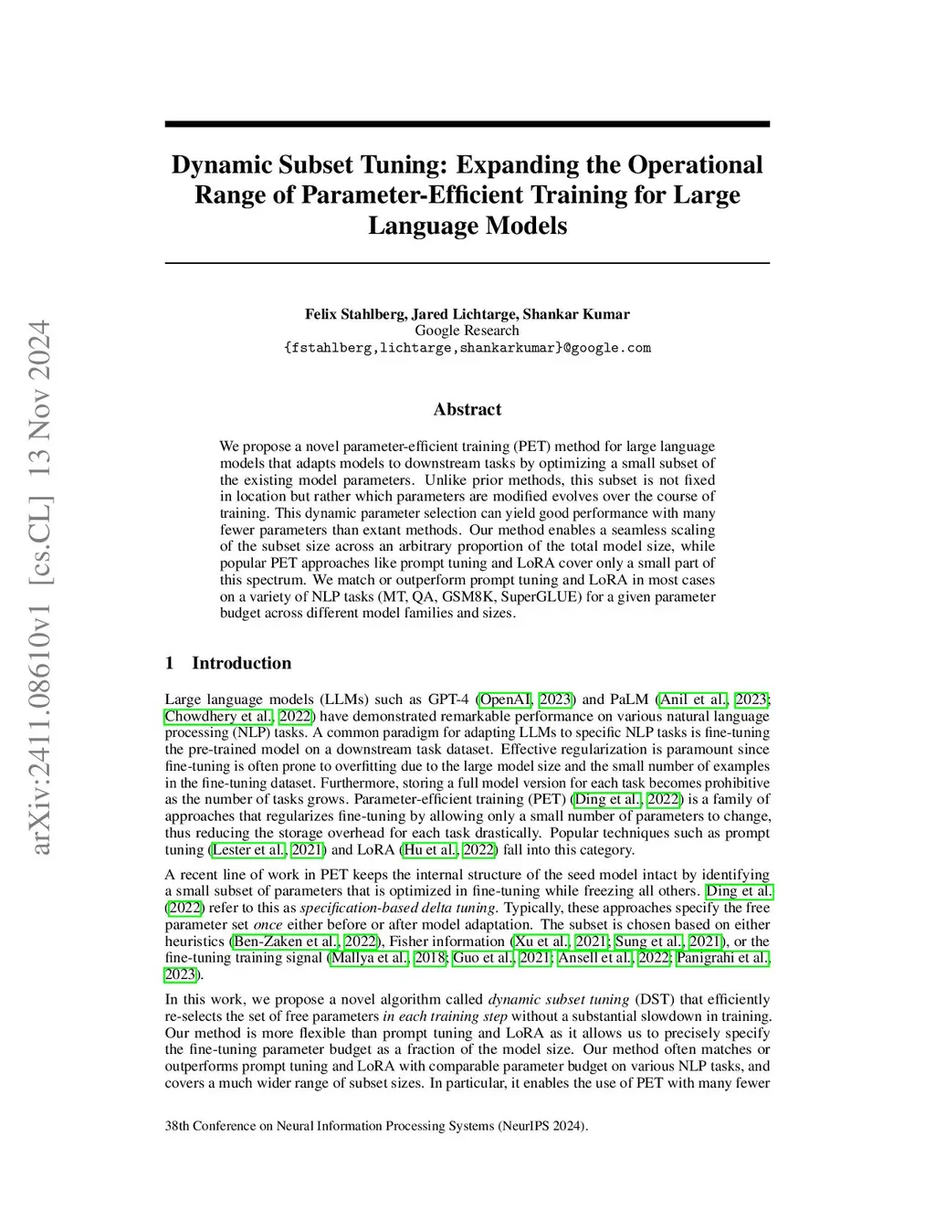 We propose a novel parameter-efficient training (PET) method for large language models that adapts models to downstream tasks by optimizing a small subset of the existing model parameters. Unlike prior methods, this subset is not fixed in location but rather which parameters are modified evolves over the course of training. This dynamic parameter selection can yield good performance with many fewer parameters than extant methods. Our method enables a seamless scaling of the subset size across an arbitrary proportion of the total model size, while popular PET approaches like prompt tuning and LoRA cover only a small part of this spectrum. We match or outperform prompt tuning and LoRA in most cases on a variety of NLP tasks (MT, QA, GSM8K, SuperGLUE) for a given parameter budget across different model families and sizes.