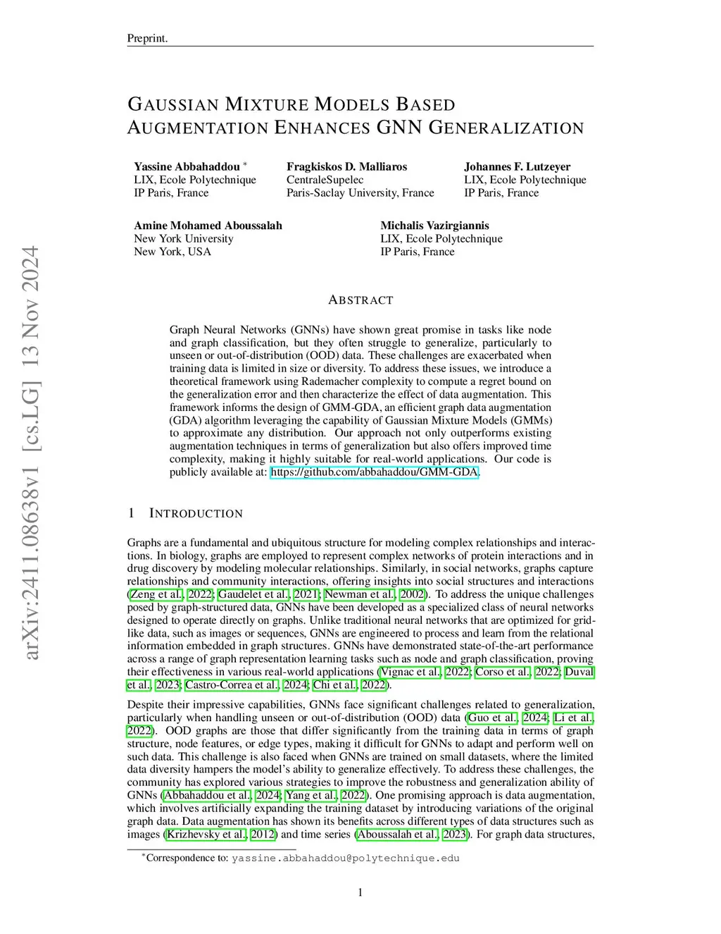 Graph Neural Networks (GNNs) have shown great promise in tasks like node and graph classification, but they often struggle to generalize, particularly to unseen or out-of-distribution (OOD) data. These challenges are exacerbated when training data is limited in size or diversity. To address these issues, we introduce a theoretical framework using Rademacher complexity to compute a regret bound on the generalization error and then characterize the effect of data augmentation. This framework informs the design of GRATIN, an efficient graph data augmentation algorithm leveraging the capability of Gaussian Mixture Models (GMMs) to approximate any distribution. Our approach not only outperforms existing augmentation techniques in terms of generalization but also offers improved time complexity, making it highly suitable for real-world applications.