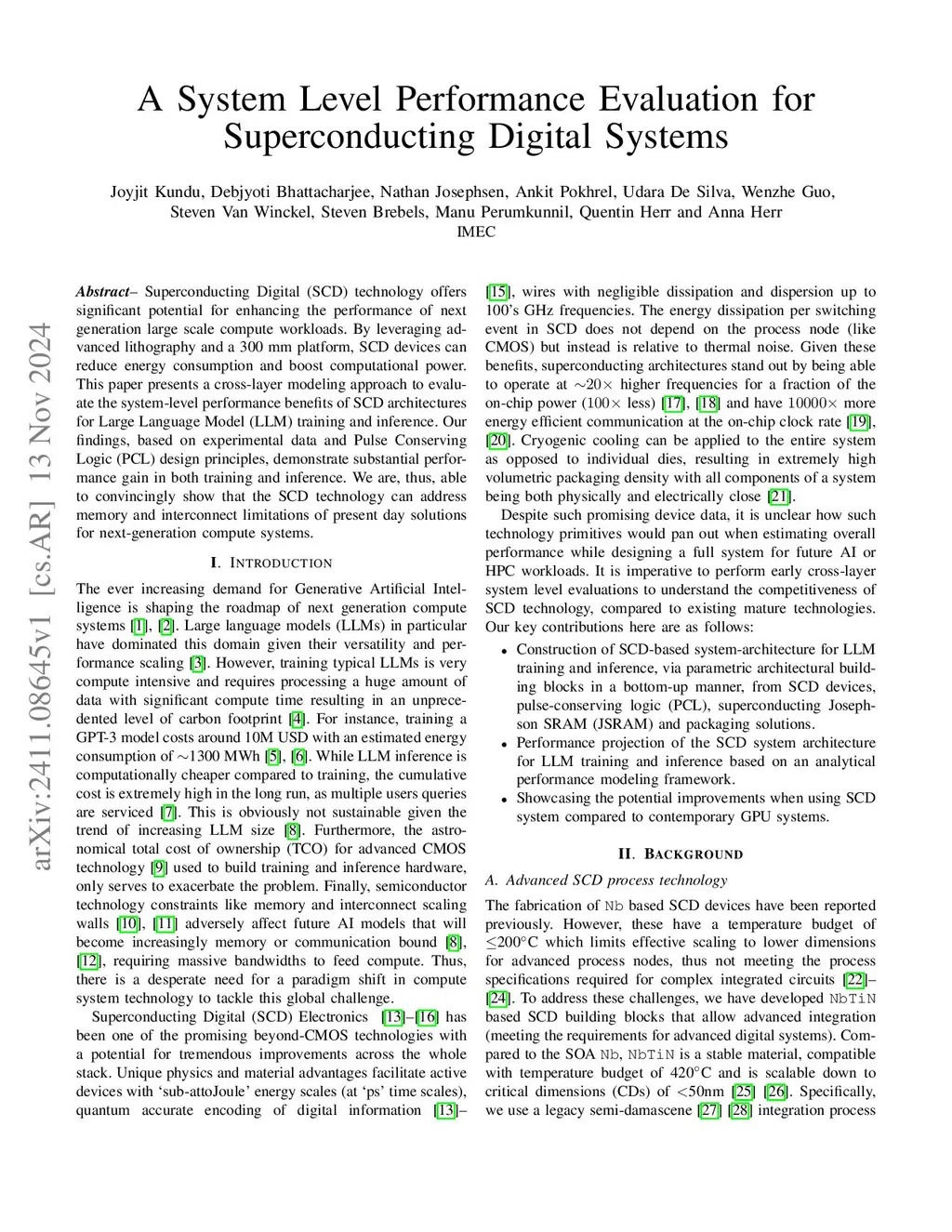 Superconducting Digital (SCD) technology offers significant potential for enhancing the performance of next generation large scale compute workloads. By leveraging advanced lithography and a 300 mm platform, SCD devices can reduce energy consumption and boost computational power. This paper presents a cross-layer modeling approach to evaluate the system-level performance benefits of SCD architectures for Large Language Model (LLM) training and inference. Our findings, based on experimental data and Pulse Conserving Logic (PCL) design principles, demonstrate substantial performance gain in both training and inference. We are, thus, able to convincingly show that the SCD technology can address memory and interconnect limitations of present day solutions for next-generation compute systems.