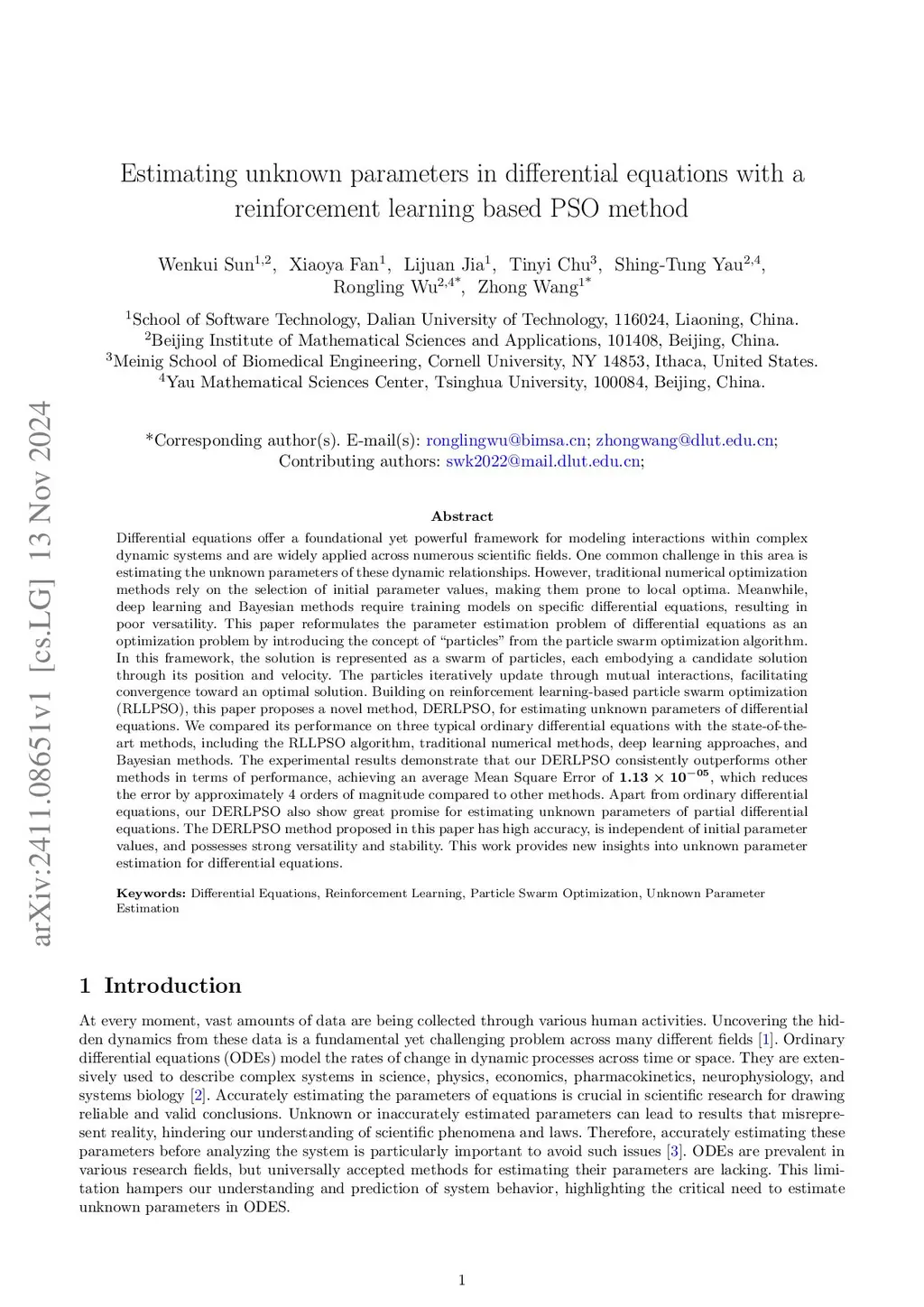 Differential equations offer a foundational yet powerful framework for modeling interactions within complex dynamic systems and are widely applied across numerous scientific fields. One common challenge in this area is estimating the unknown parameters of these dynamic relationships. However, traditional numerical optimization methods rely on the selection of initial parameter values, making them prone to local optima. Meanwhile, deep learning and Bayesian methods require training models on specific differential equations, resulting in poor versatility. This paper reformulates the parameter estimation problem of differential equations as an optimization problem by introducing the concept of particles from the particle swarm optimization algorithm. Building on reinforcement learning-based particle swarm optimization (RLLPSO), this paper proposes a novel method, DERLPSO, for estimating unknown parameters of differential equations. We compared its performance on three typical ordinary differential equations with the state-of-the-art methods, including the RLLPSO algorithm, traditional numerical methods, deep learning approaches, and Bayesian methods. The experimental results demonstrate that our DERLPSO consistently outperforms other methods in terms of performance, achieving an average Mean Square Error of 1.13e-05, which reduces the error by approximately 4 orders of magnitude compared to other methods. Apart from ordinary differential equations, our DERLPSO also show great promise for estimating unknown parameters of partial differential equations. The DERLPSO method proposed in this paper has high accuracy, is independent of initial parameter values, and possesses strong versatility and stability. This work provides new insights into unknown parameter estimation for differential equations.