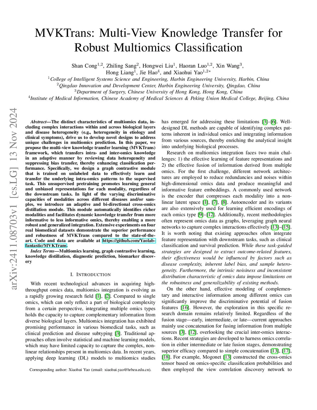 MVKTrans: Multi-View Knowledge Transfer for Robust Multiomics