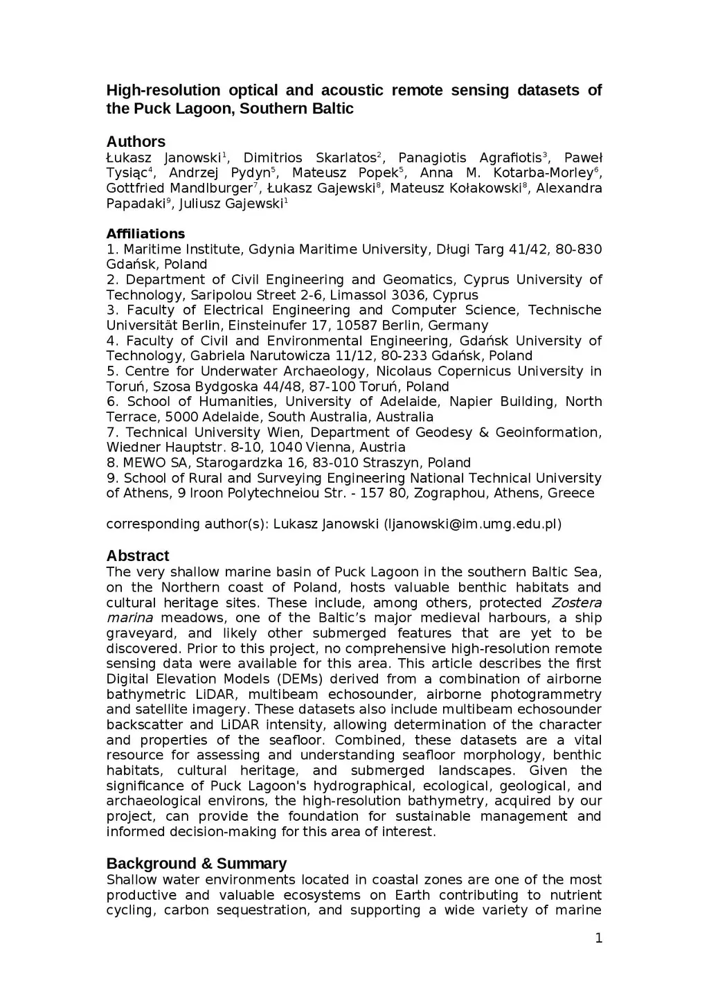 The very shallow marine basin of Puck Lagoon in the southern Baltic Sea, on the Northern coast of Poland, hosts valuable benthic habitats and cultural heritage sites. These include, among others, protected Zostera marina meadows, one of the Baltic's major medieval harbours, a ship graveyard, and likely other submerged features that are yet to be discovered. Prior to this project, no comprehensive high-resolution remote sensing data were available for this area. This article describes the first Digital Elevation Models (DEMs) derived from a combination of airborne bathymetric LiDAR, multibeam echosounder, airborne photogrammetry and satellite imagery. These datasets also include multibeam echosounder backscatter and LiDAR intensity, allowing determination of the character and properties of the seafloor. Combined, these datasets are a vital resource for assessing and understanding seafloor morphology, benthic habitats, cultural heritage, and submerged landscapes. Given the significance of Puck Lagoon's hydrographical, ecological, geological, and archaeological environs, the high-resolution bathymetry, acquired by our project, can provide the foundation for sustainable management and informed decision-making for this area of interest.