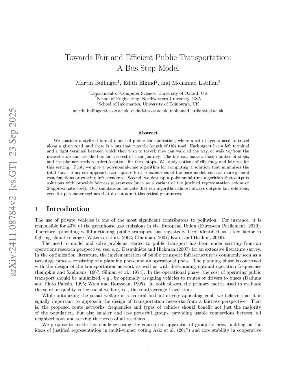 We consider a stylized formal model of public transportation, where a set of agents need to travel along a given road, and there is a bus that runs the length of this road. Each agent has a left terminal and a right terminal between which they wish to travel; they can walk all the way, or walk to/from the nearest stop and use the bus for the rest of their journey. The bus can make a fixed number of stops, and the planner needs to select locations for these stops. We study notions of efficiency and fairness for this setting. First, we give a polynomial-time algorithm for computing a solution that minimizes the total travel time; our approach can capture further extensions of the base model, such as more general cost functions or existing infrastructure. Second, we develop a polynomial-time algorithm that outputs solutions with provable fairness guarantees (such as a variant of the justified representation axiom or -approximate core) as long as the agents' costs only depend on the distance they need to walk. Our simulations indicate that our algorithm almost always outputs fair solutions, even for parameter regimes that do not admit theoretical guarantees.