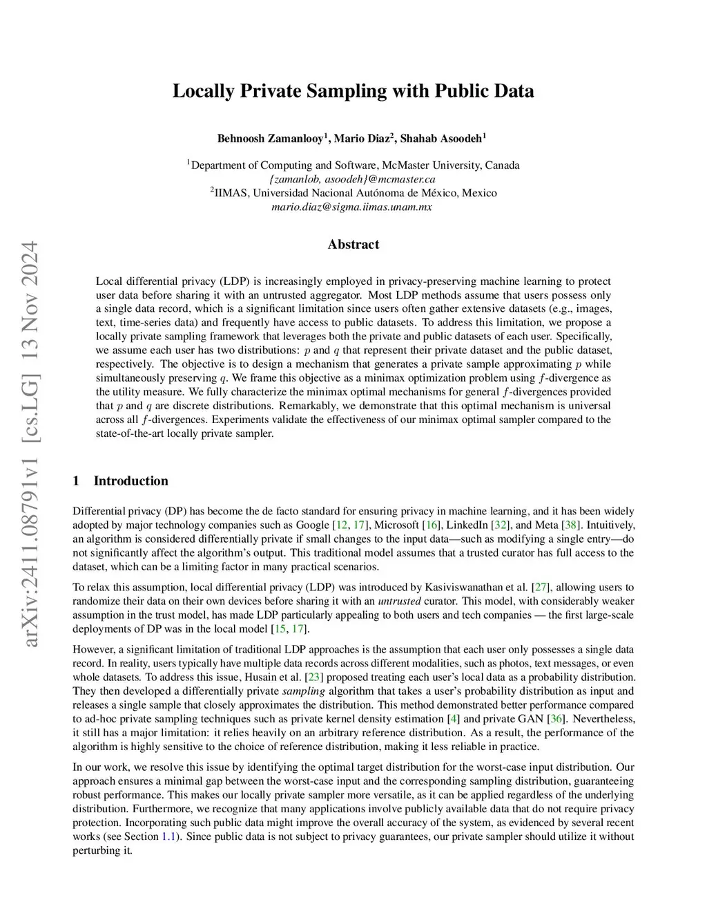 Local differential privacy (LDP) is increasingly employed in privacy-preserving machine learning to protect user data before sharing it with an untrusted aggregator. Most LDP methods assume that users possess only a single data record, which is a significant limitation since users often gather extensive datasets (e.g., images, text, time-series data) and frequently have access to public datasets. To address this limitation, we propose a locally private sampling framework that leverages both the private and public datasets of each user. Specifically, we assume each user has two distributions: and that represent their private dataset and the public dataset, respectively. The objective is to design a mechanism that generates a private sample approximating while simultaneously preserving . We frame this objective as a minimax optimization problem using -divergence as the utility measure. We fully characterize the minimax optimal mechanisms for general -divergences provided that and are discrete distributions. Remarkably, we demonstrate that this optimal mechanism is universal across all -divergences. Experiments validate the effectiveness of our minimax optimal sampler compared to the state-of-the-art locally private sampler.