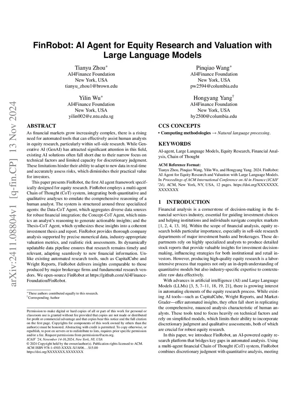 As financial markets grow increasingly complex, there is a rising need for automated tools that can effectively assist human analysts in equity research, particularly within sell-side research. While Generative AI (GenAI) has attracted significant attention in this field, existing AI solutions often fall short due to their narrow focus on technical factors and limited capacity for discretionary judgment. These limitations hinder their ability to adapt to new data in real-time and accurately assess risks, which diminishes their practical value for investors. This paper presents FinRobot, the first AI agent framework specifically designed for equity research. FinRobot employs a multi-agent Chain of Thought (CoT) system, integrating both quantitative and qualitative analyses to emulate the comprehensive reasoning of a human analyst. The system is structured around three specialized agents: the Data-CoT Agent, which aggregates diverse data sources for robust financial integration; the Concept-CoT Agent, which mimics an analysts reasoning to generate actionable insights; and the Thesis-CoT Agent, which synthesizes these insights into a coherent investment thesis and report. FinRobot provides thorough company analysis supported by precise numerical data, industry-appropriate valuation metrics, and realistic risk assessments. Its dynamically updatable data pipeline ensures that research remains timely and relevant, adapting seamlessly to new financial information. Unlike existing automated research tools, such as CapitalCube and Wright Reports, FinRobot delivers insights comparable to those produced by major brokerage firms and fundamental research vendors. We open-source FinRobot at \url{https://github. com/AI4Finance-Foundation/FinRobot}.