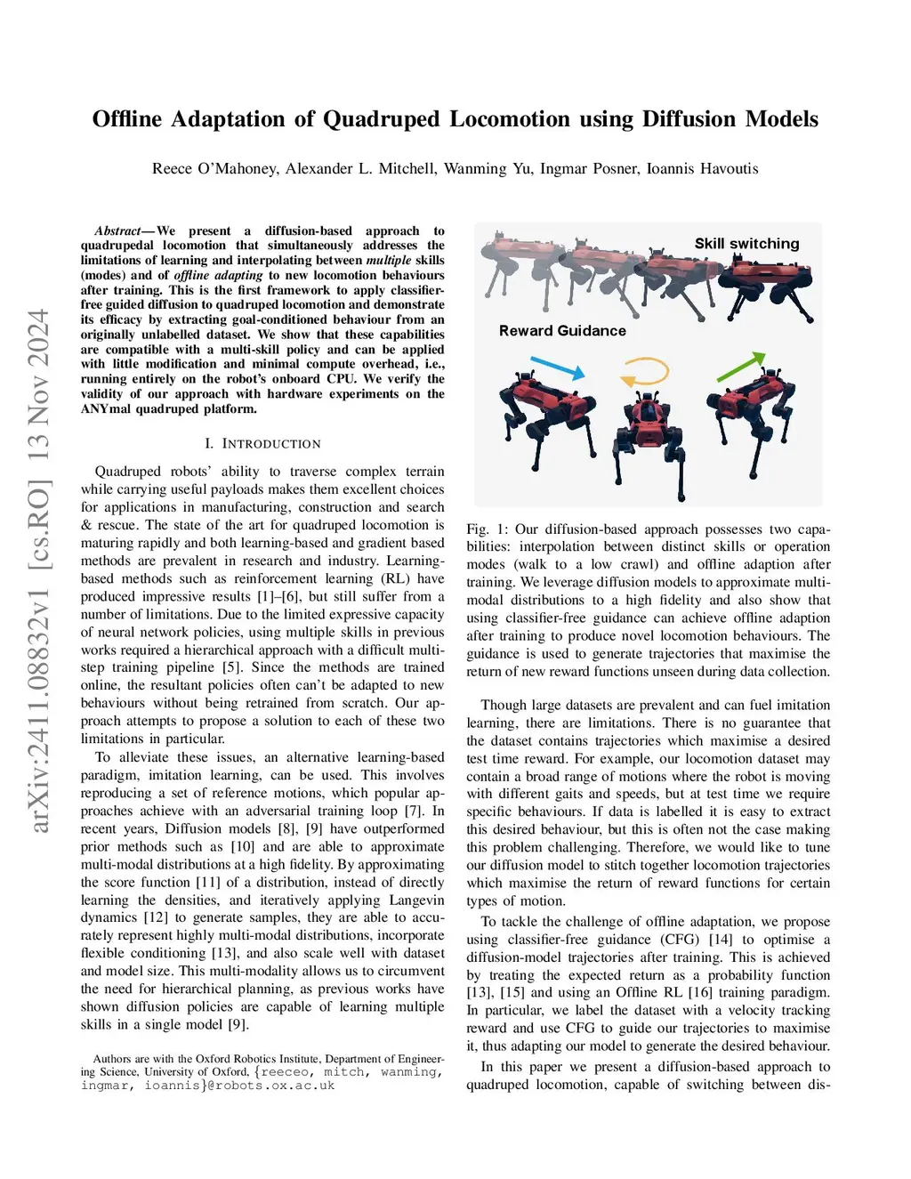 We present a diffusion-based approach to quadrupedal locomotion that simultaneously addresses the limitations of learning and interpolating between multiple skills and of (modes) offline adapting to new locomotion behaviours after training. This is the first framework to apply classifier-free guided diffusion to quadruped locomotion and demonstrate its efficacy by extracting goal-conditioned behaviour from an originally unlabelled dataset. We show that these capabilities are compatible with a multi-skill policy and can be applied with little modification and minimal compute overhead, i.e., running entirely on the robots onboard CPU. We verify the validity of our approach with hardware experiments on the ANYmal quadruped platform.