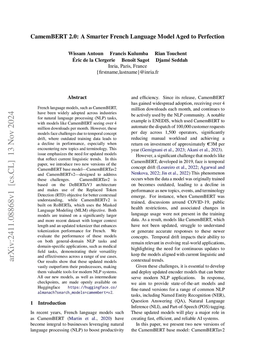 French language models, such as CamemBERT, have been widely adopted across industries for natural language processing (NLP) tasks, with models like CamemBERT seeing over 4 million downloads per month. However, these models face challenges due to temporal concept drift, where outdated training data leads to a decline in performance, especially when encountering new topics and terminology. This issue emphasizes the need for updated models that reflect current linguistic trends. In this paper, we introduce two new versions of the CamemBERT base model-CamemBERTav2 and CamemBERTv2-designed to address these challenges. CamemBERTav2 is based on the DeBERTaV3 architecture and makes use of the Replaced Token Detection (RTD) objective for better contextual understanding, while CamemBERTv2 is built on RoBERTa, which uses the Masked Language Modeling (MLM) objective. Both models are trained on a significantly larger and more recent dataset with longer context length and an updated tokenizer that enhances tokenization performance for French. We evaluate the performance of these models on both general-domain NLP tasks and domain-specific applications, such as medical field tasks, demonstrating their versatility and effectiveness across a range of use cases. Our results show that these updated models vastly outperform their predecessors, making them valuable tools for modern NLP systems. All our new models, as well as intermediate checkpoints, are made openly available on Huggingface.